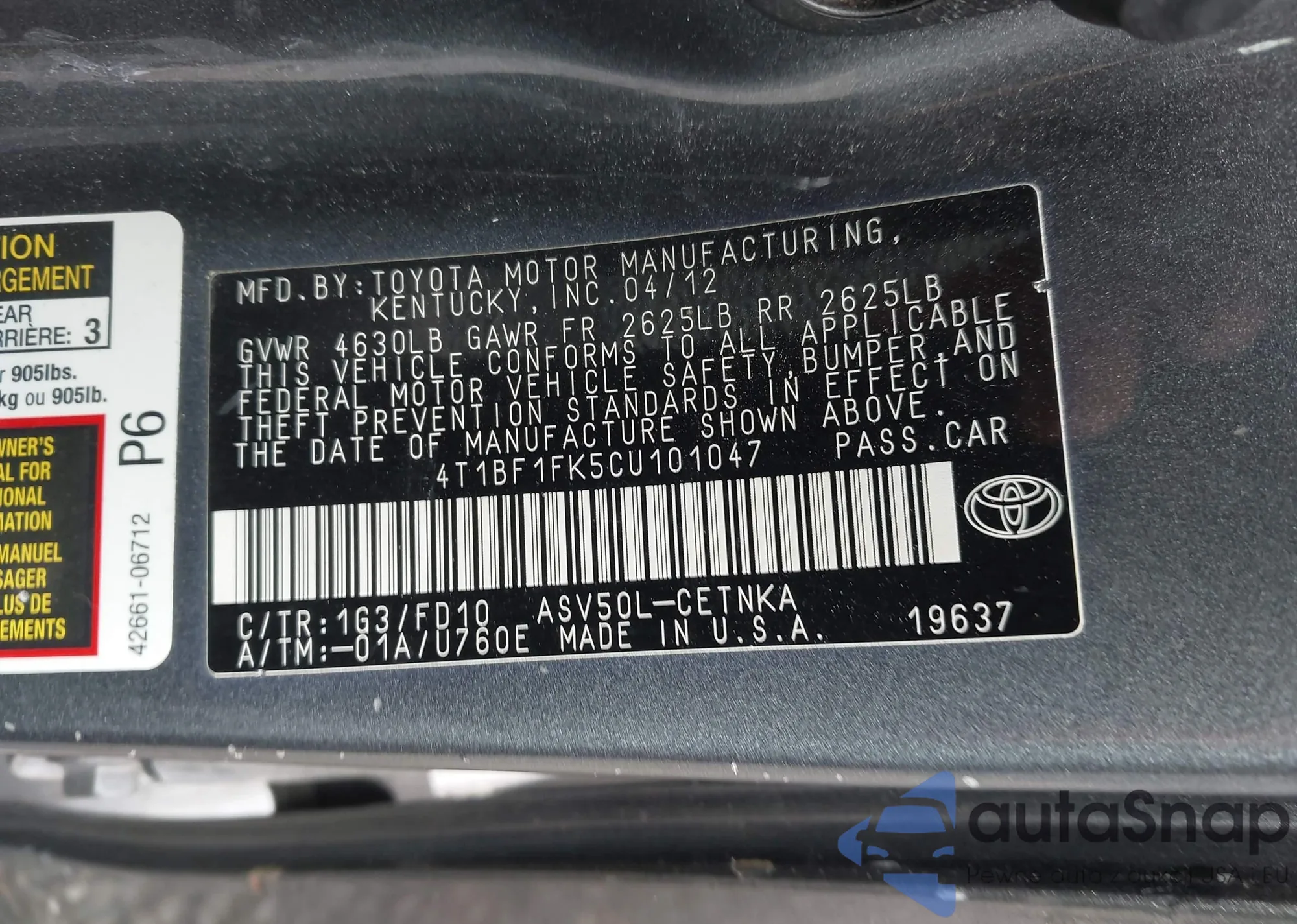 • VIN 4T1BF1FK5CU101047