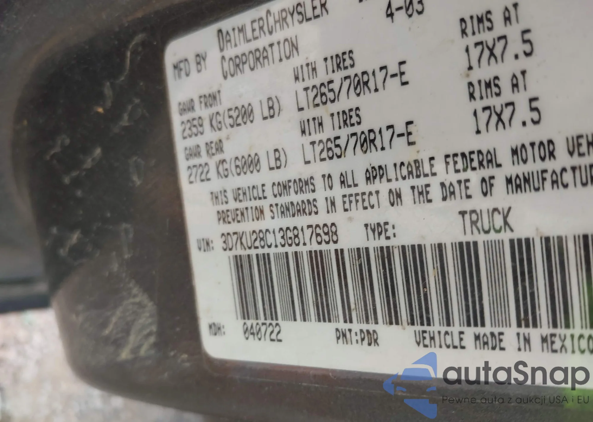 • VIN 3D7KU28C13G817698