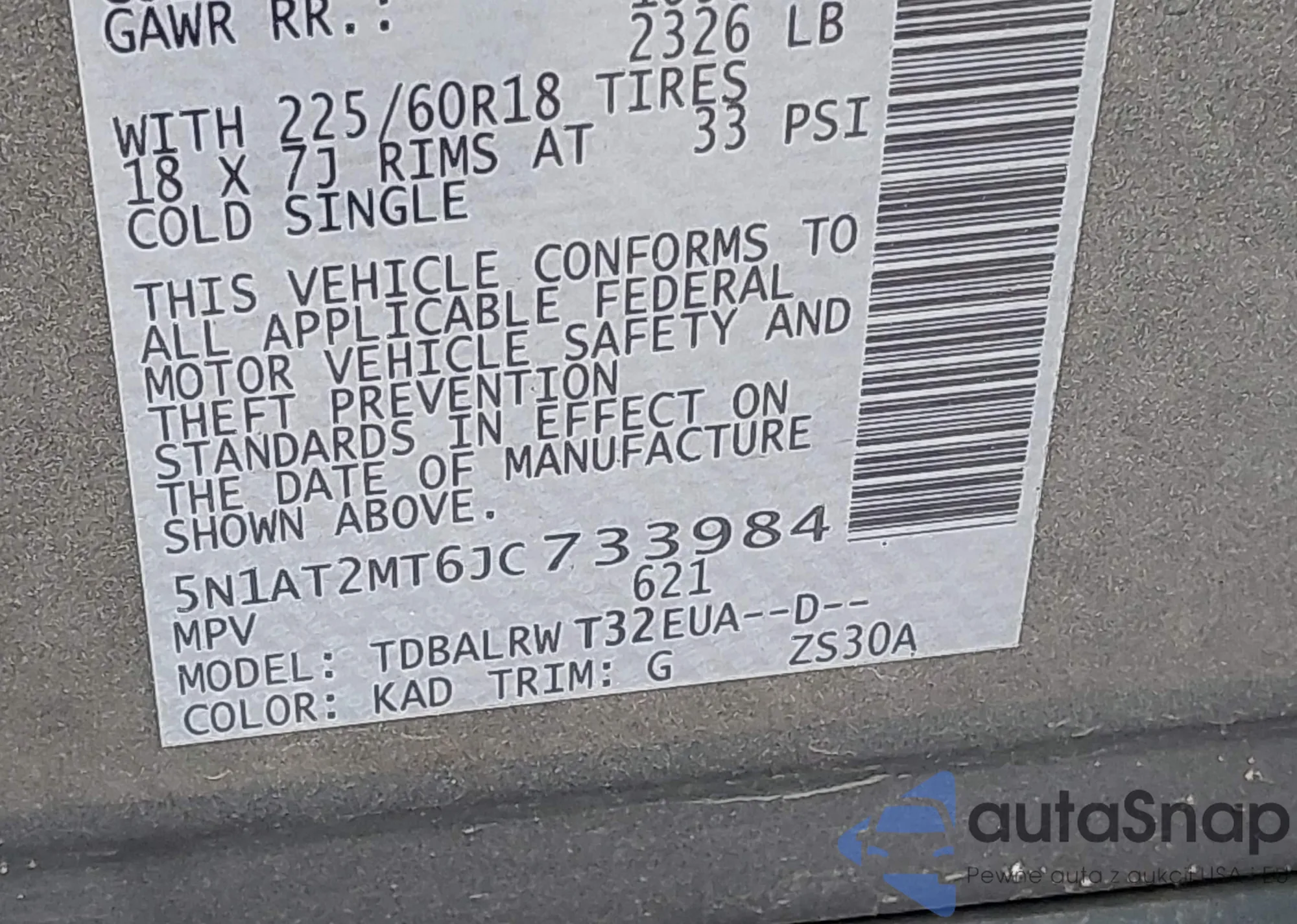 LOT: 43246845 VIN: 5NMZU3LB0JH074448