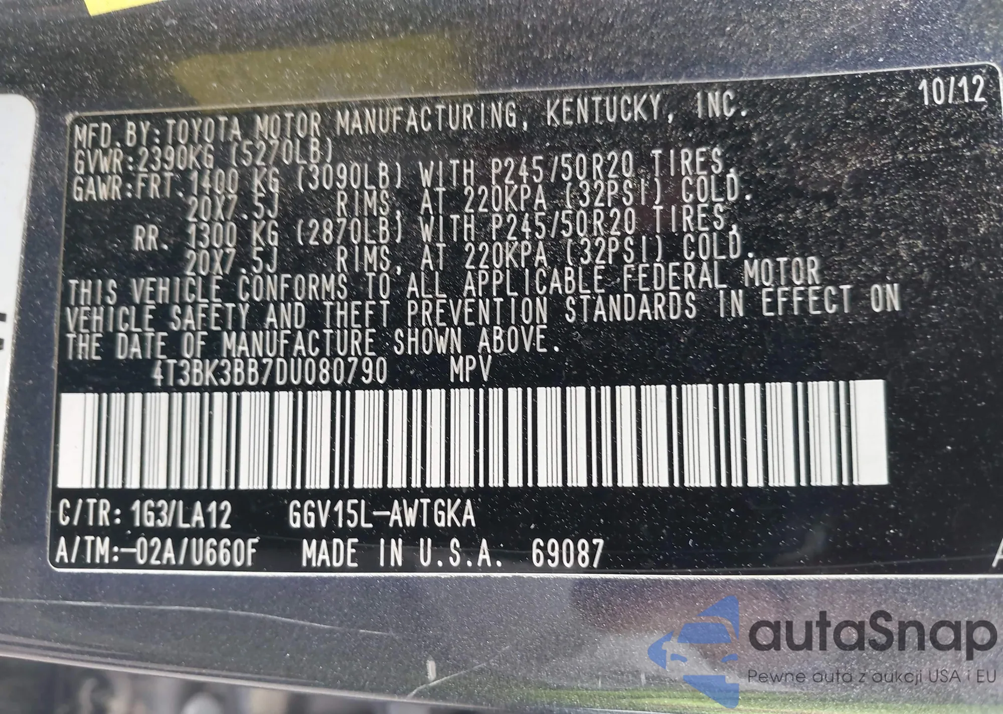 LOT: 43050744 VIN: 4T1BK46K77U010896