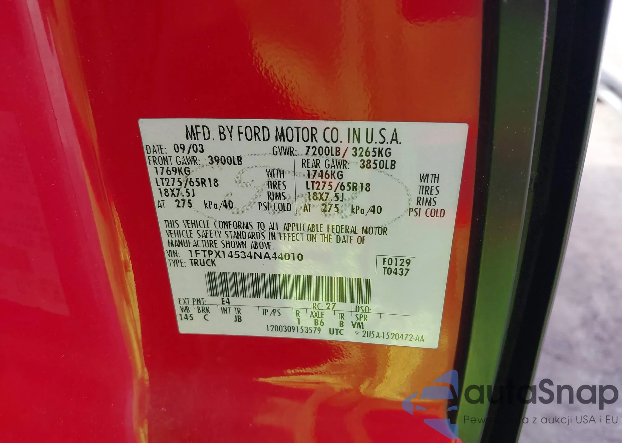 LOT: 43314010 VIN: 1GCWGAFP2J1323221