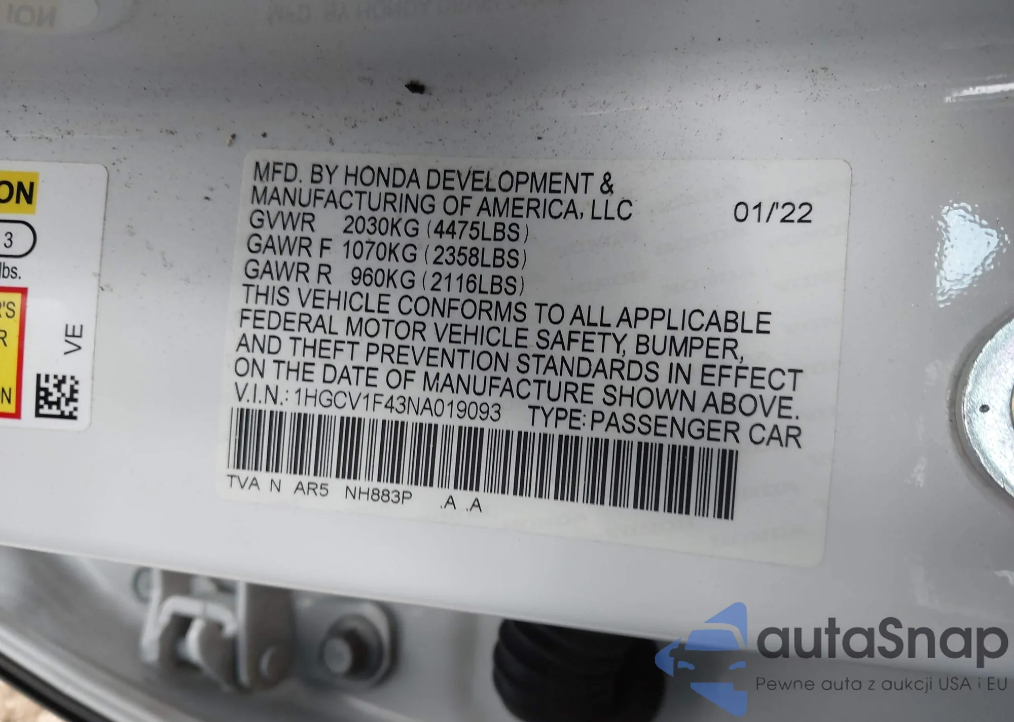LOT: 43077076 VIN: 1HGCV1F43NA019093