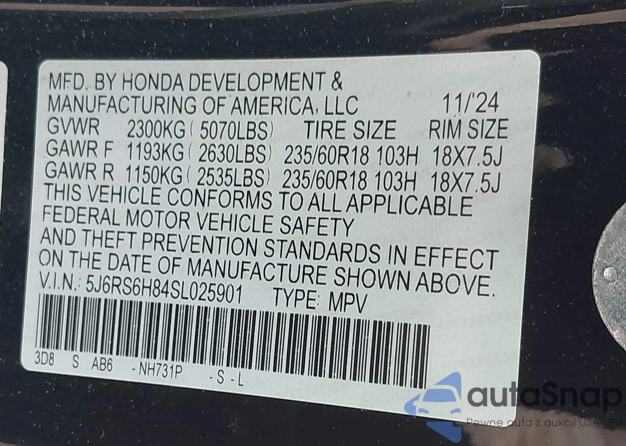 • VIN 5J6RS6H84SL025901