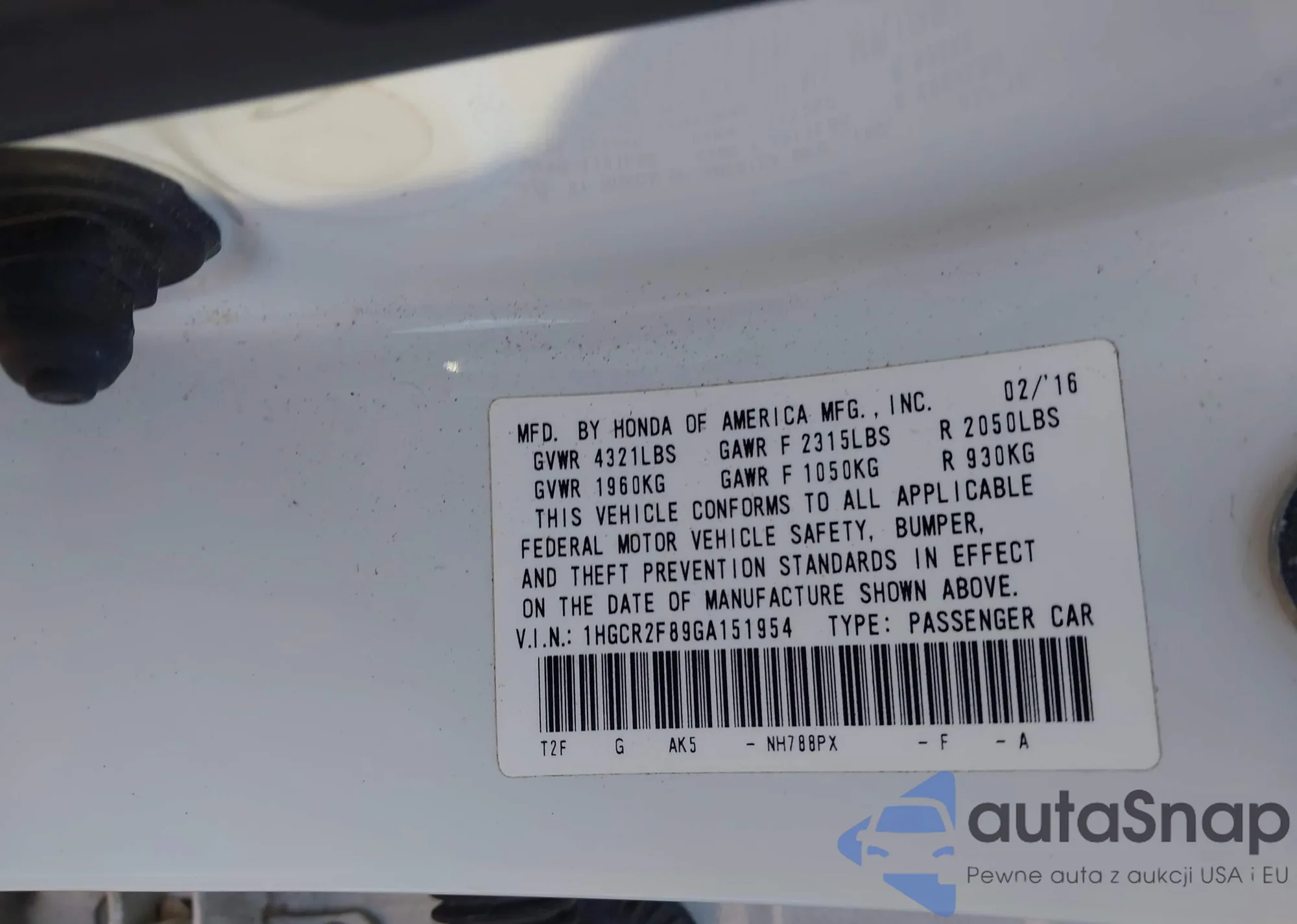 • VIN 1HGCR2F89GA151954