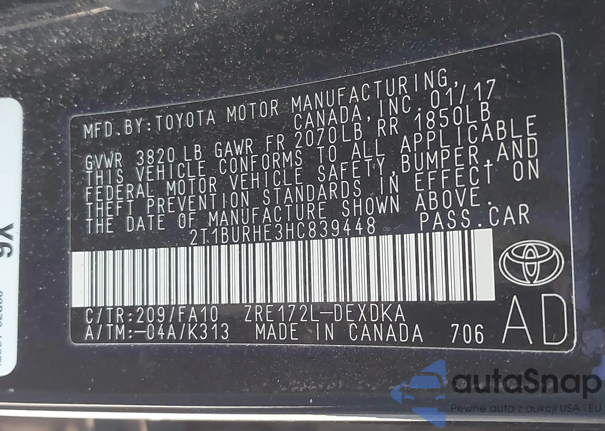 • VIN 2T1BURHE3HC839448