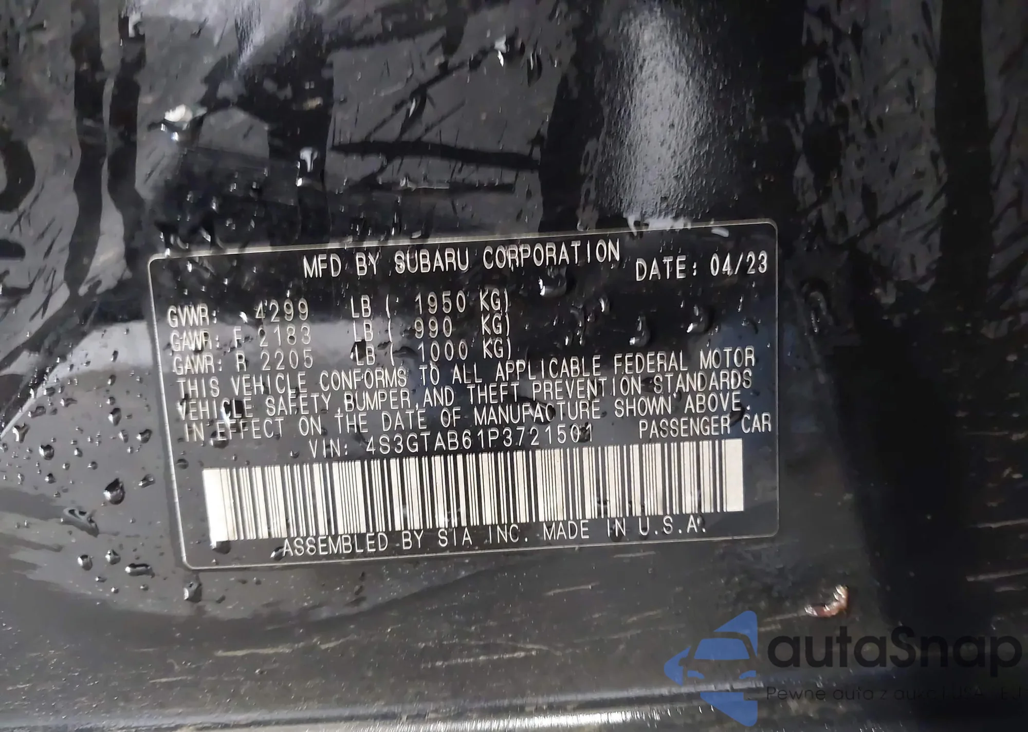 • VIN 4S3GTAB61P3721501
