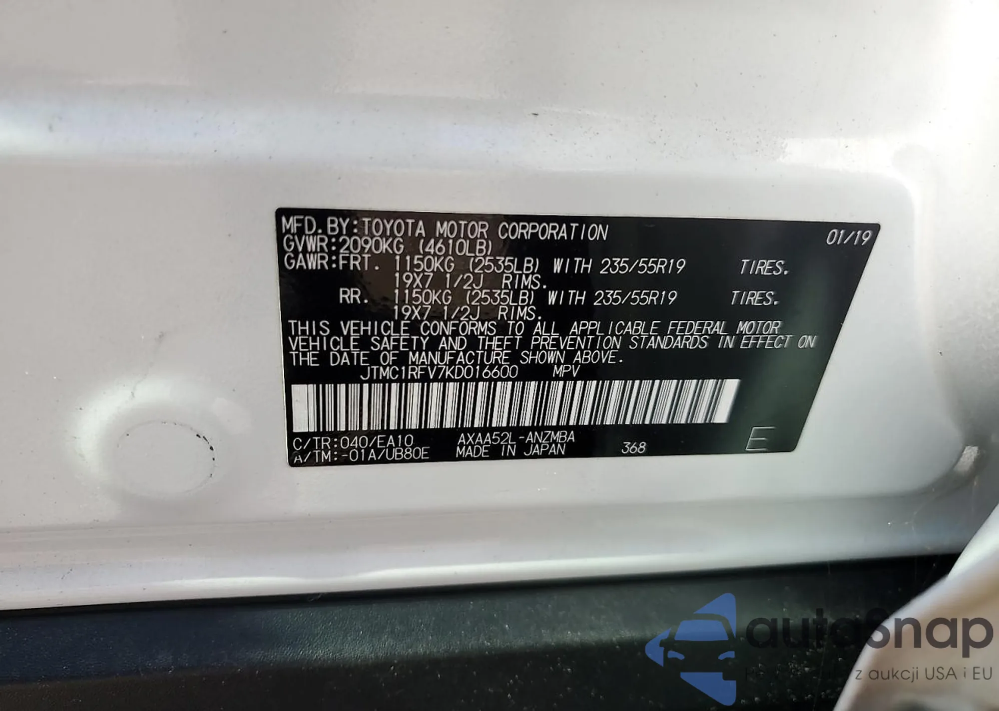 LOT: 70144565 VIN: JTMC1RFV7KD016600
