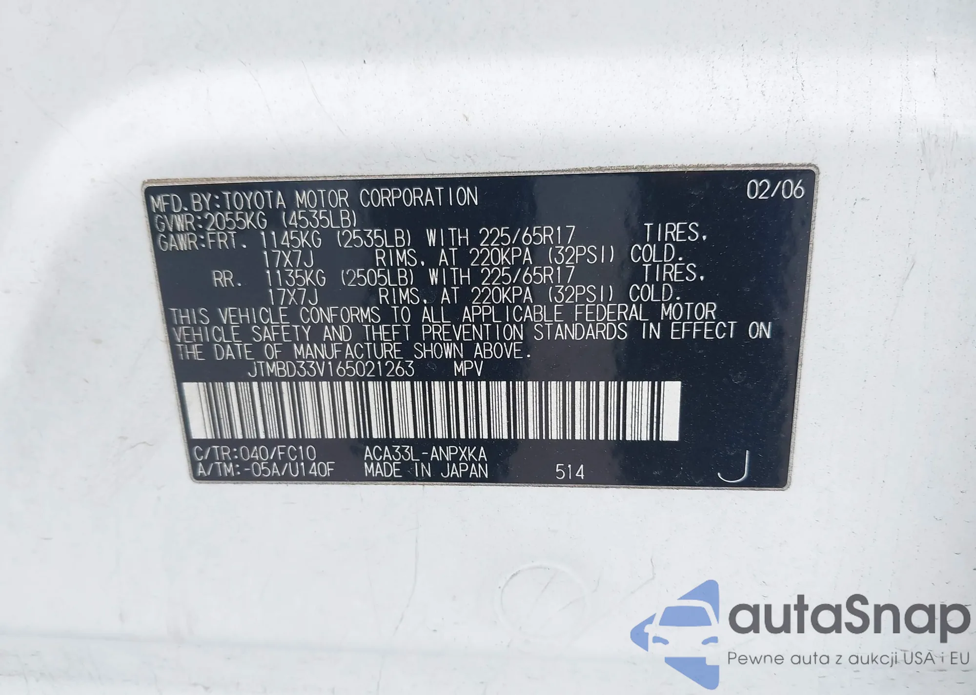 LOT: 41493259 VIN: JTMBD33V165021263