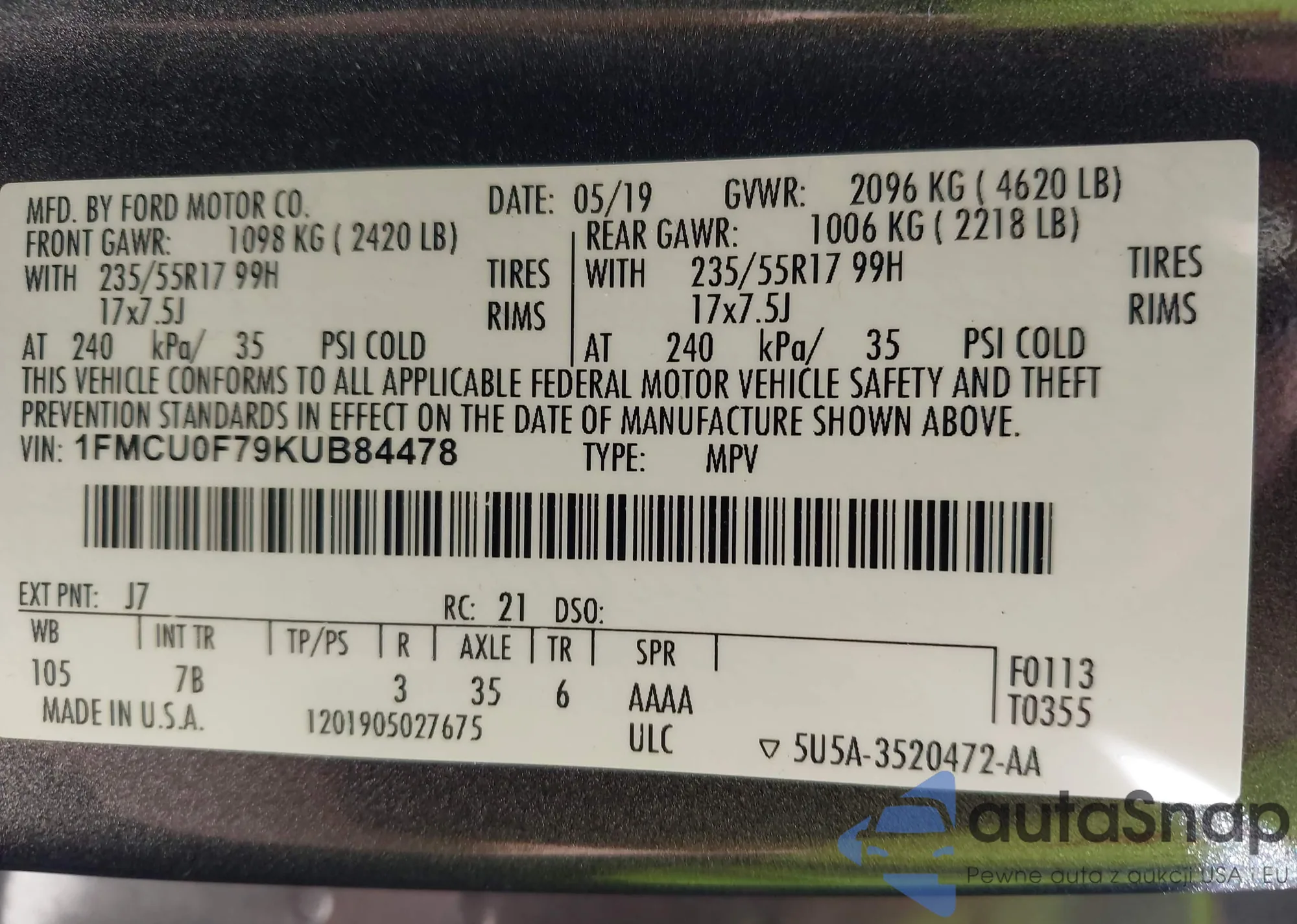 • VIN 1FMCU0F79KUB84478