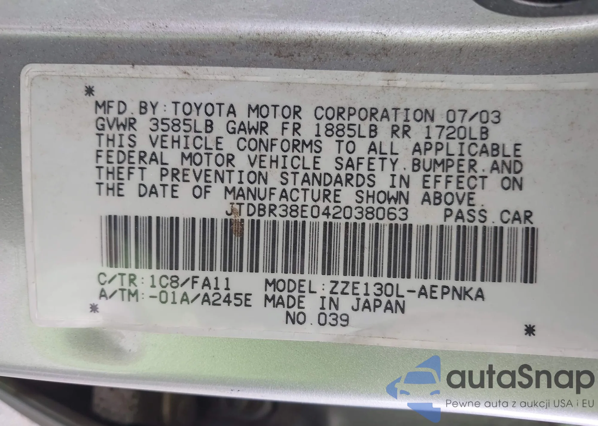 LOT: 42701839 VIN: JTDBR38E042038063