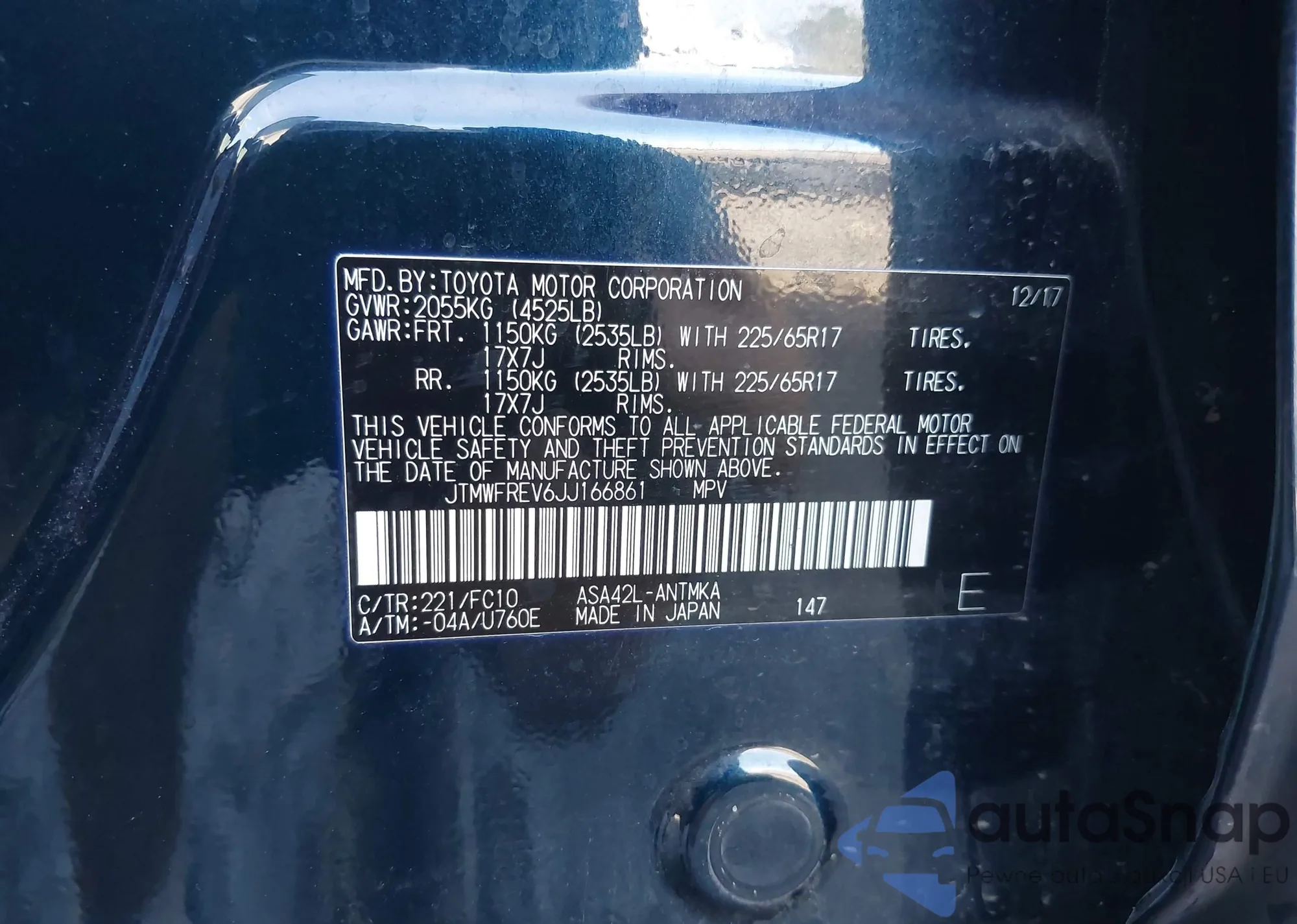 LOT: 43308894 VIN: JTMWFREV6JJ166861