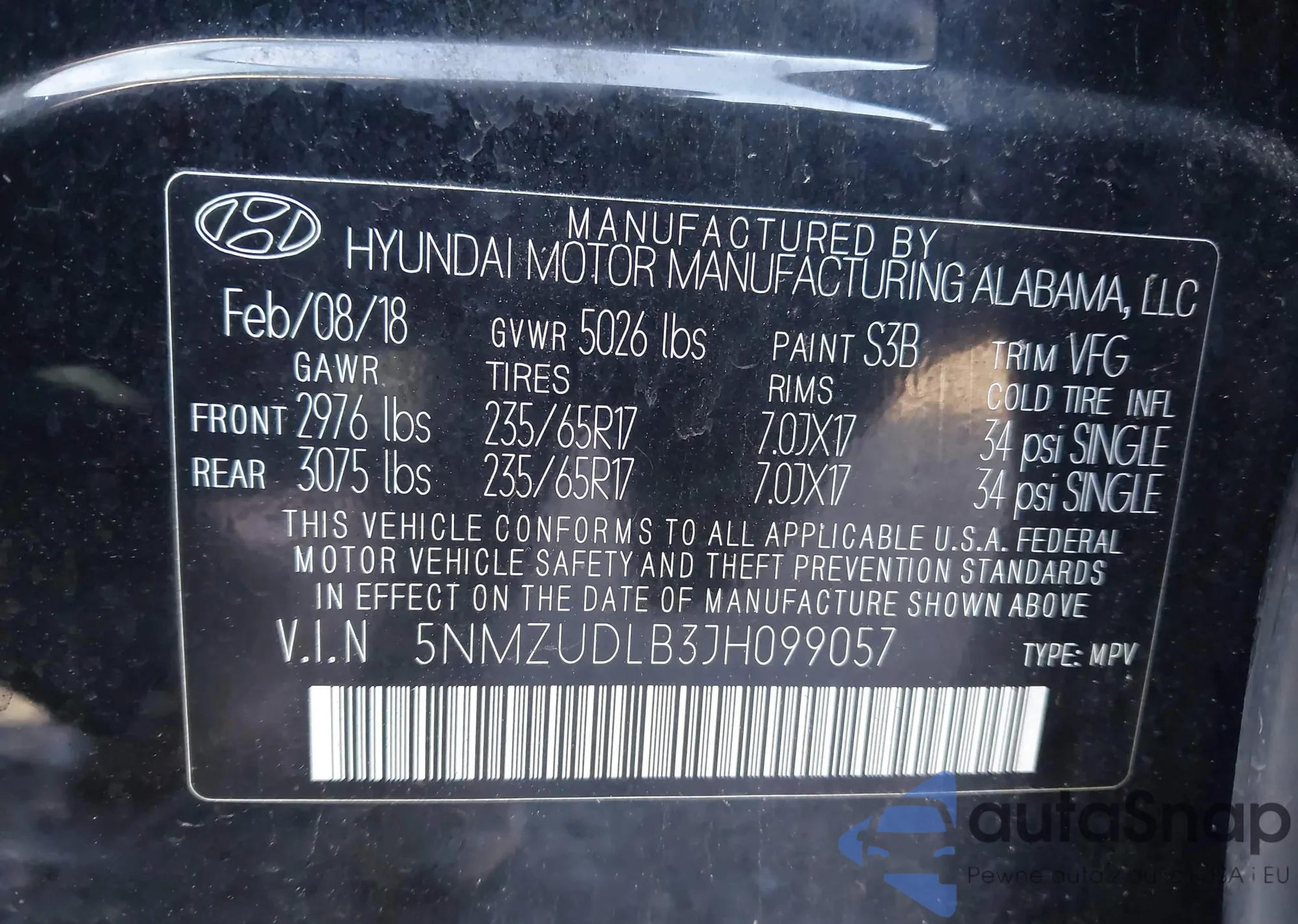 • VIN 5NMZUDLB3JH099057