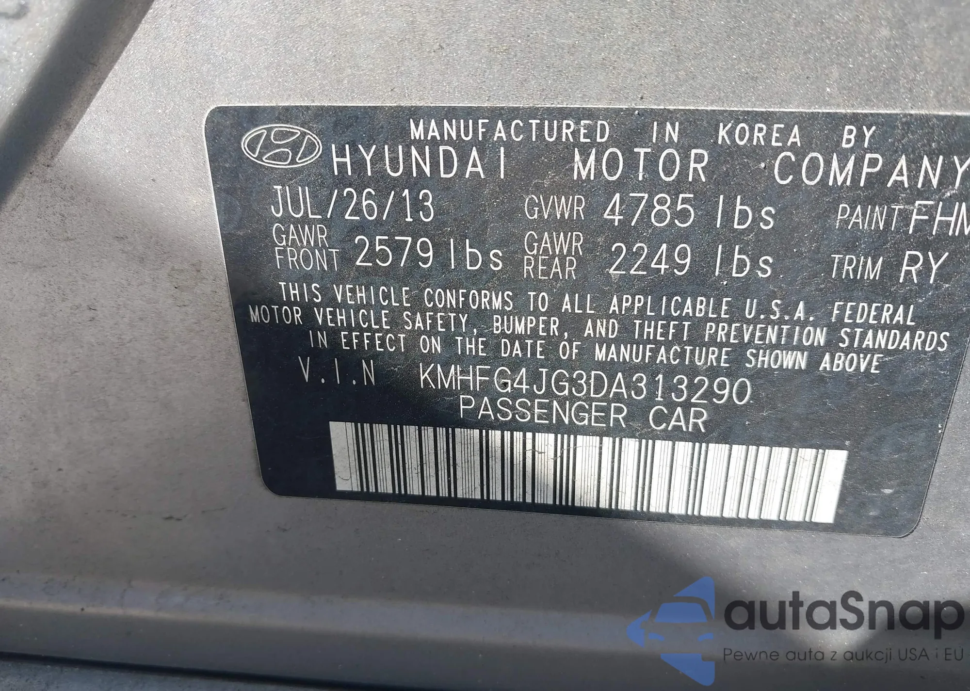 LOT: 43349370 VIN: KMHFG4JG3DA313290