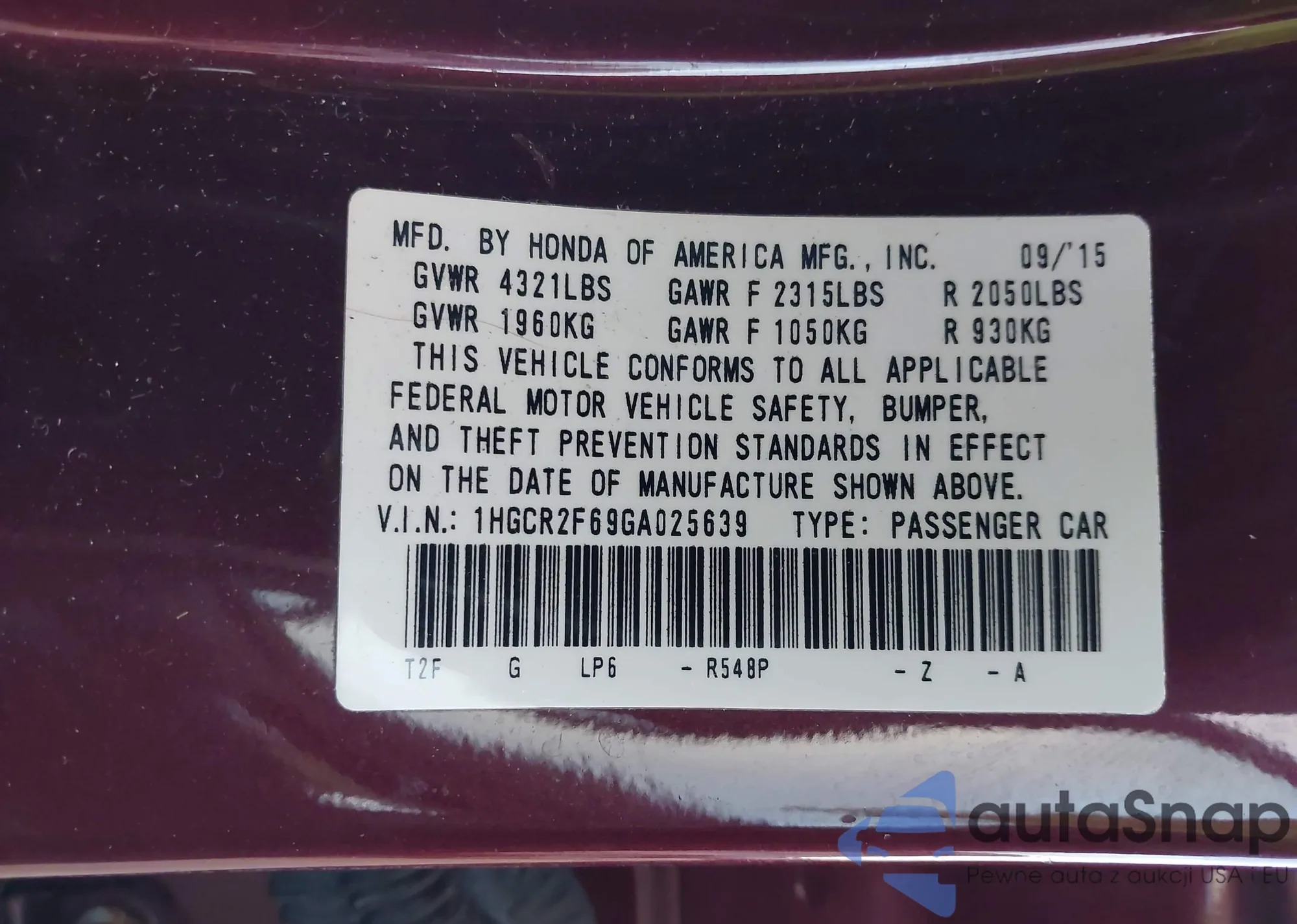 LOT: 43357311 VIN: 1HGCR2F69GA025639