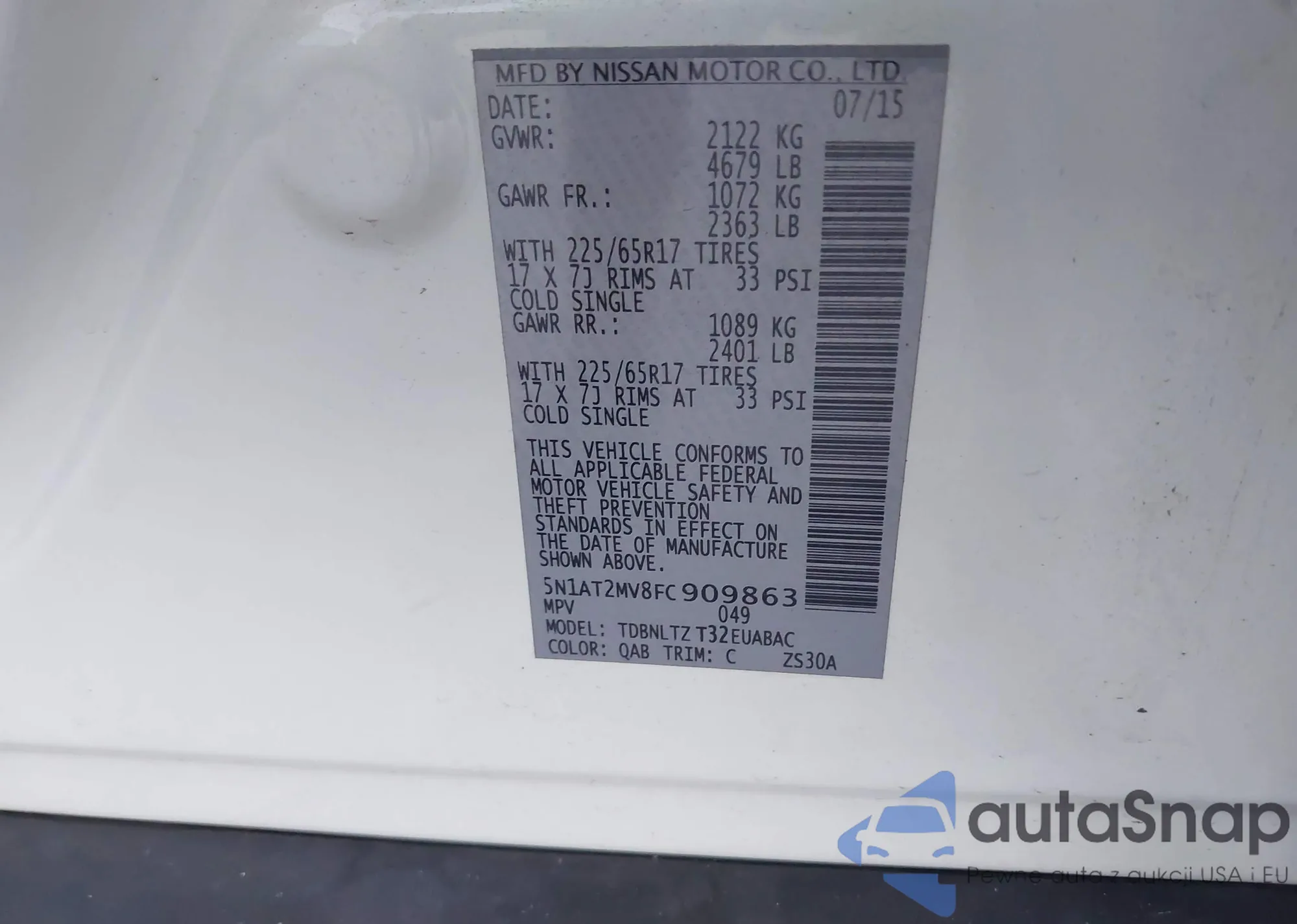 LOT: 43325107 VIN: 5N1AT2MV8FC909863