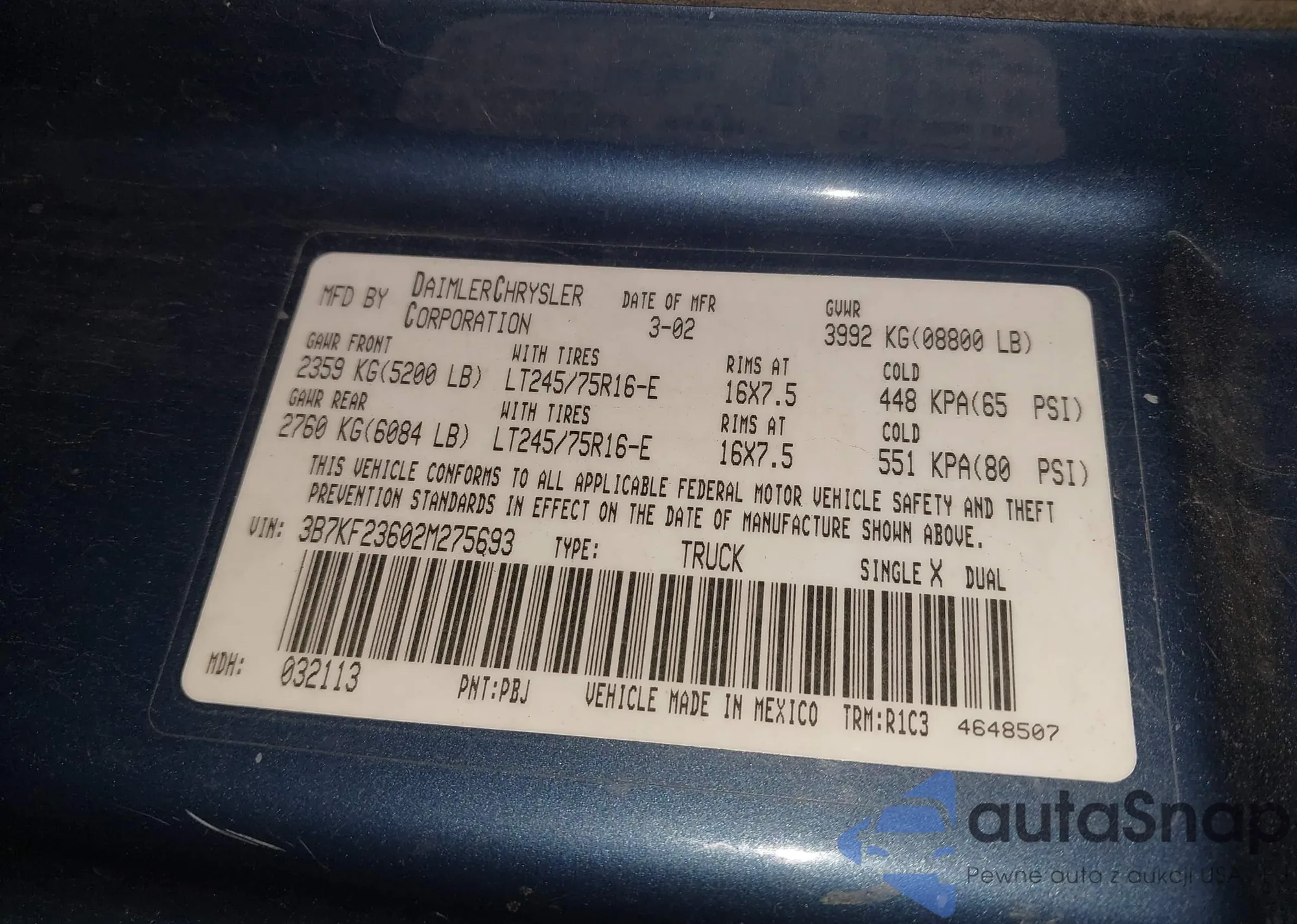 • VIN 3B7KF23602M275693