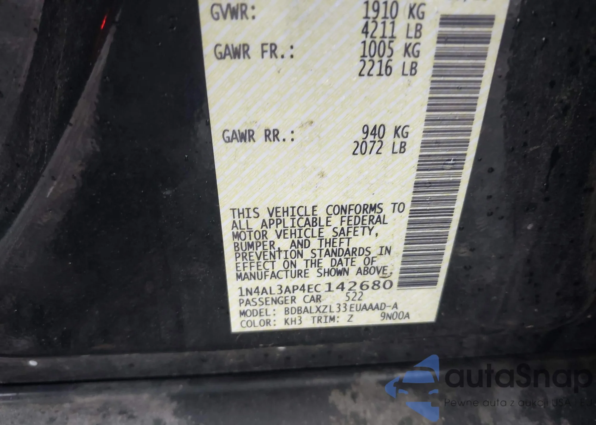 LOT: 43427782 VIN: 1N4AL3AP4EC142680