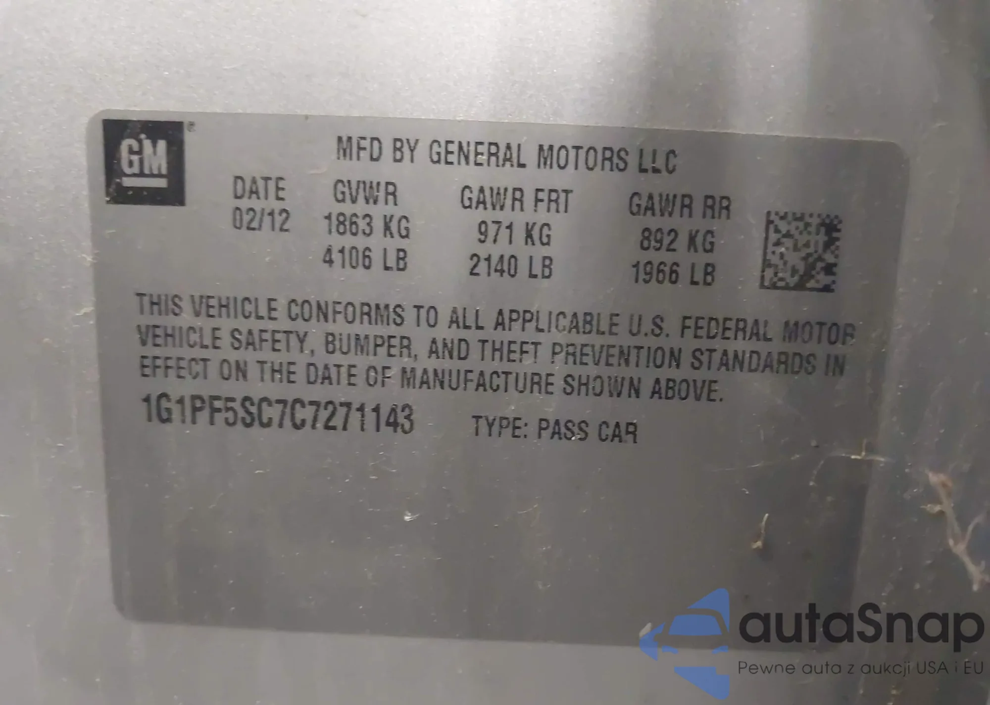 LOT: 43429093 VIN: 1G1PF5SC7C7271143