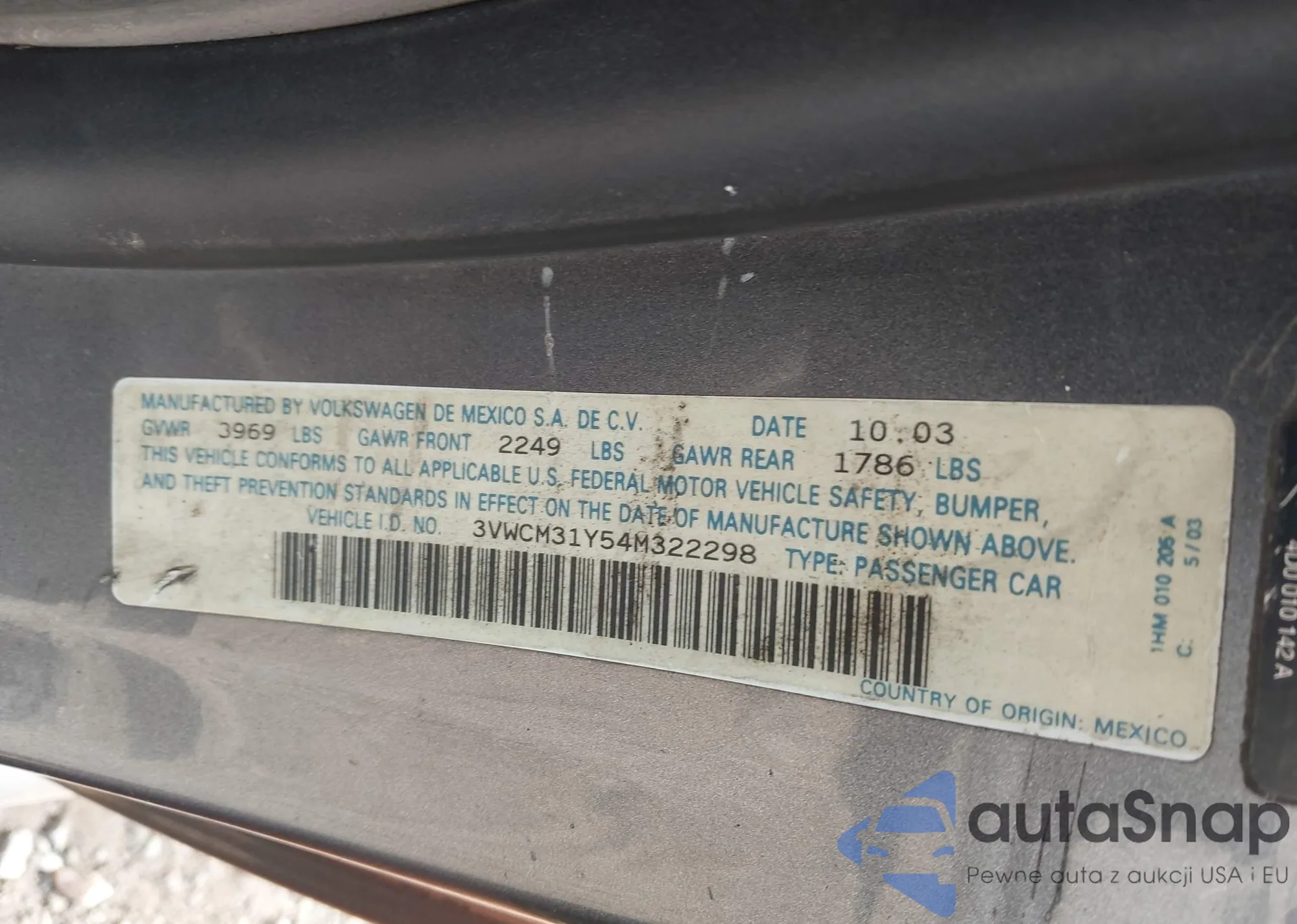 • VIN 3VWCM31Y54M322298