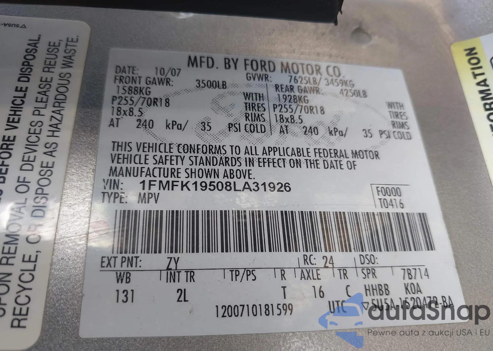 LOT: 43235547 VIN: 1FMFK19508LA31926