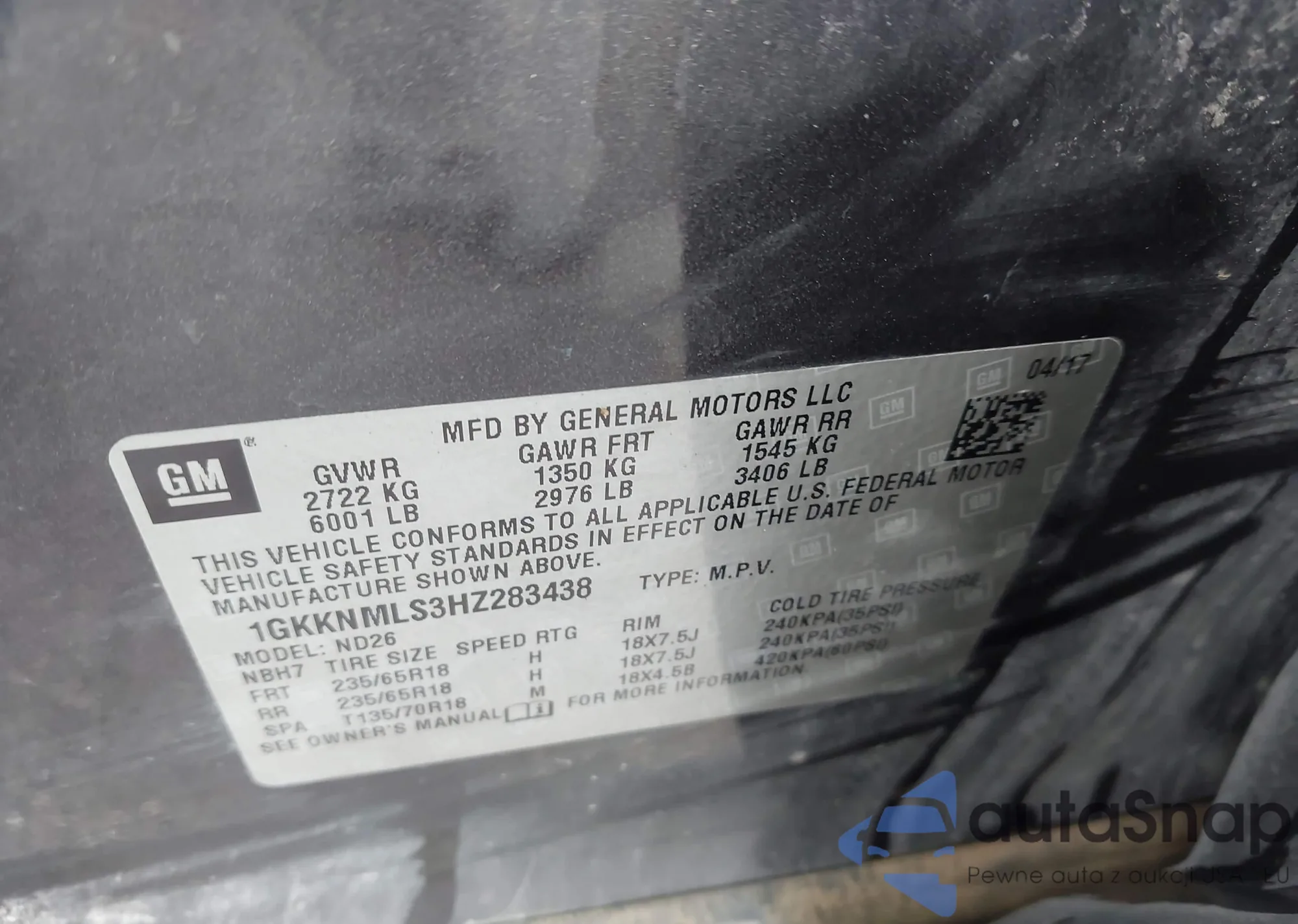 LOT: 43224244 VIN: 1GKKNMLS3HZ283438