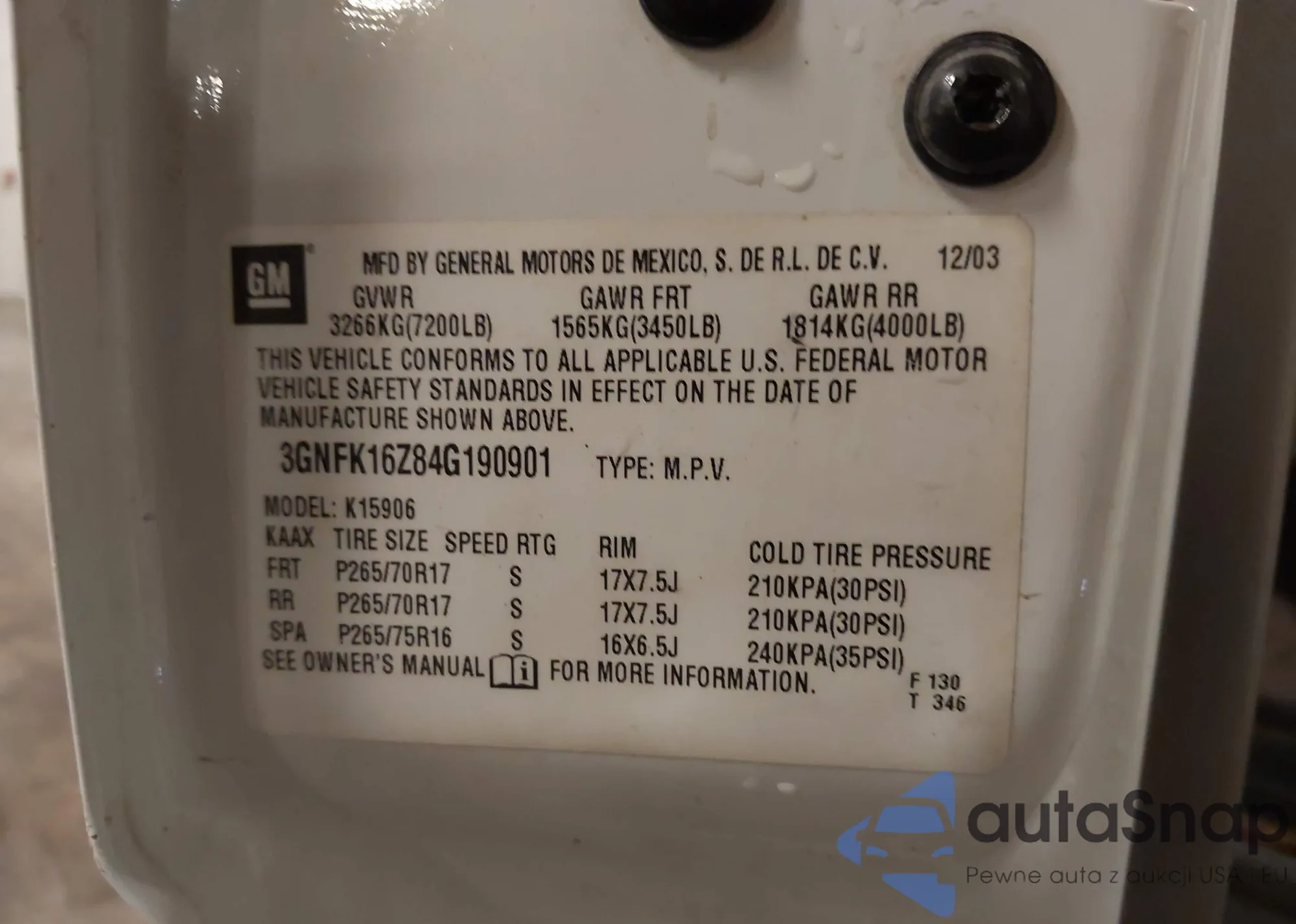 • VIN 3GNFK16Z84G190901