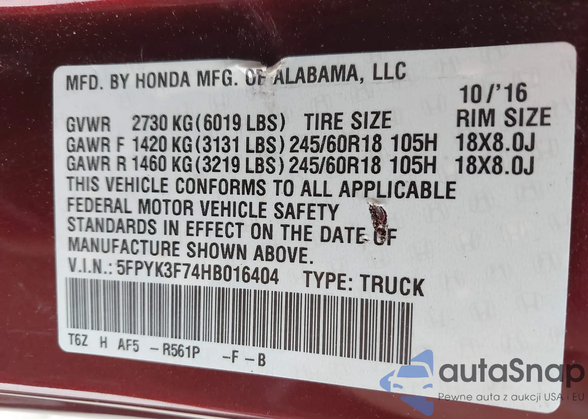 • VIN 5FPYK3F74HB016404