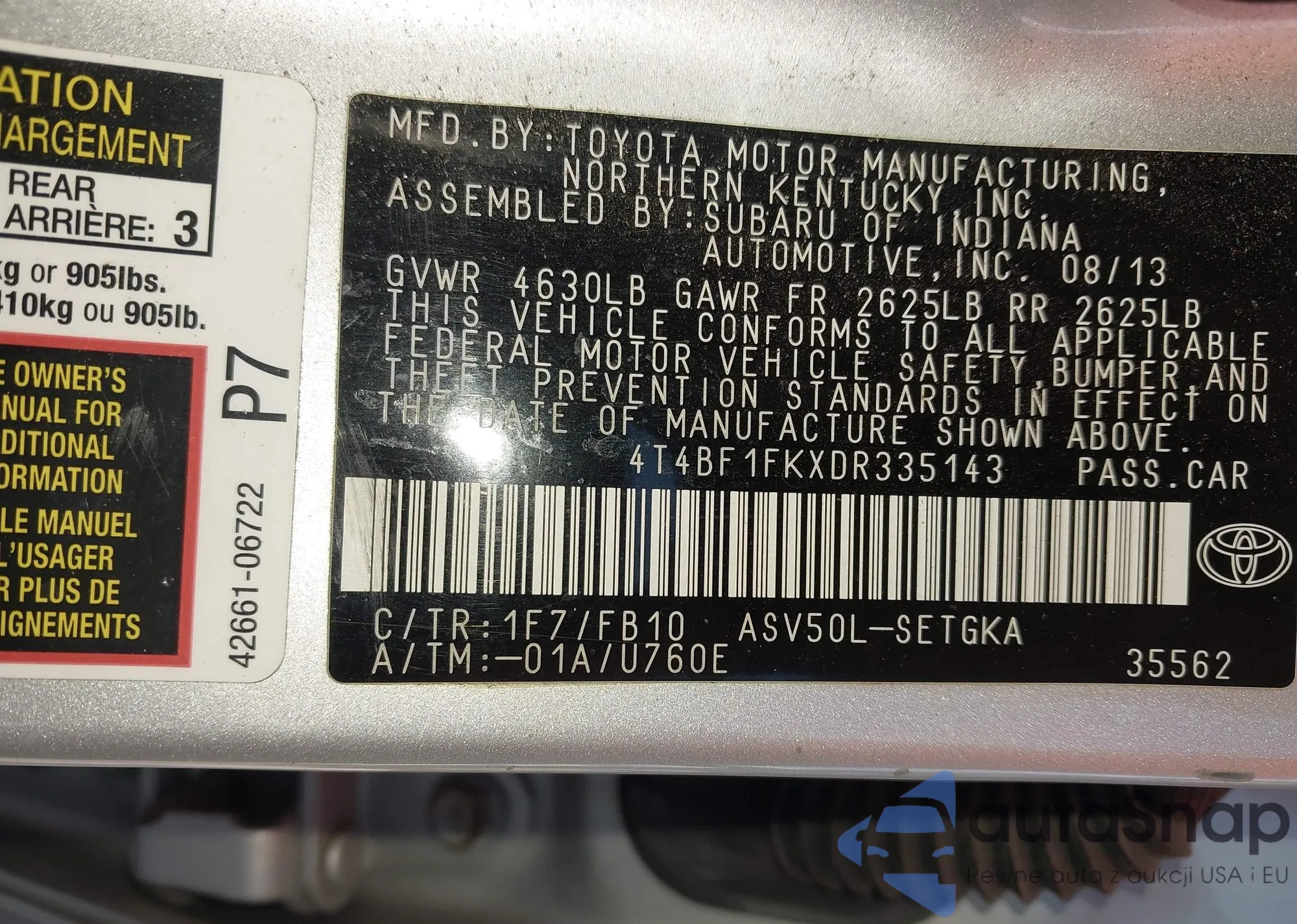 • VIN 4T4BF1FKXDR335143