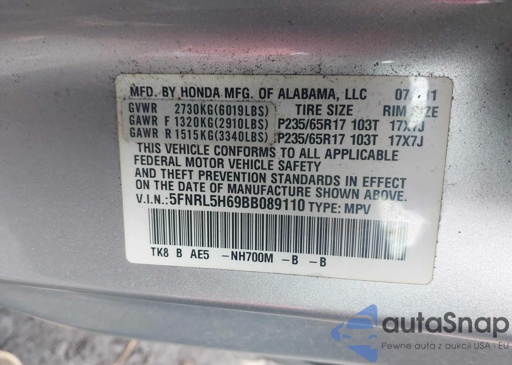 • VIN 5FNRL5H69BB089110