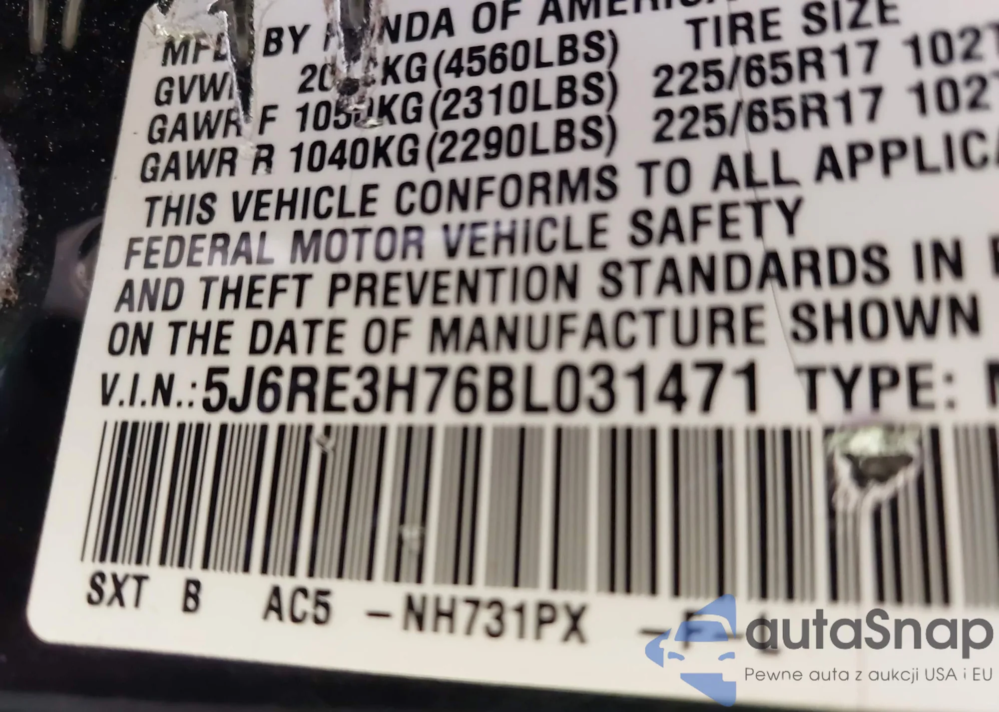 • VIN 5J6RE3H76BL031471