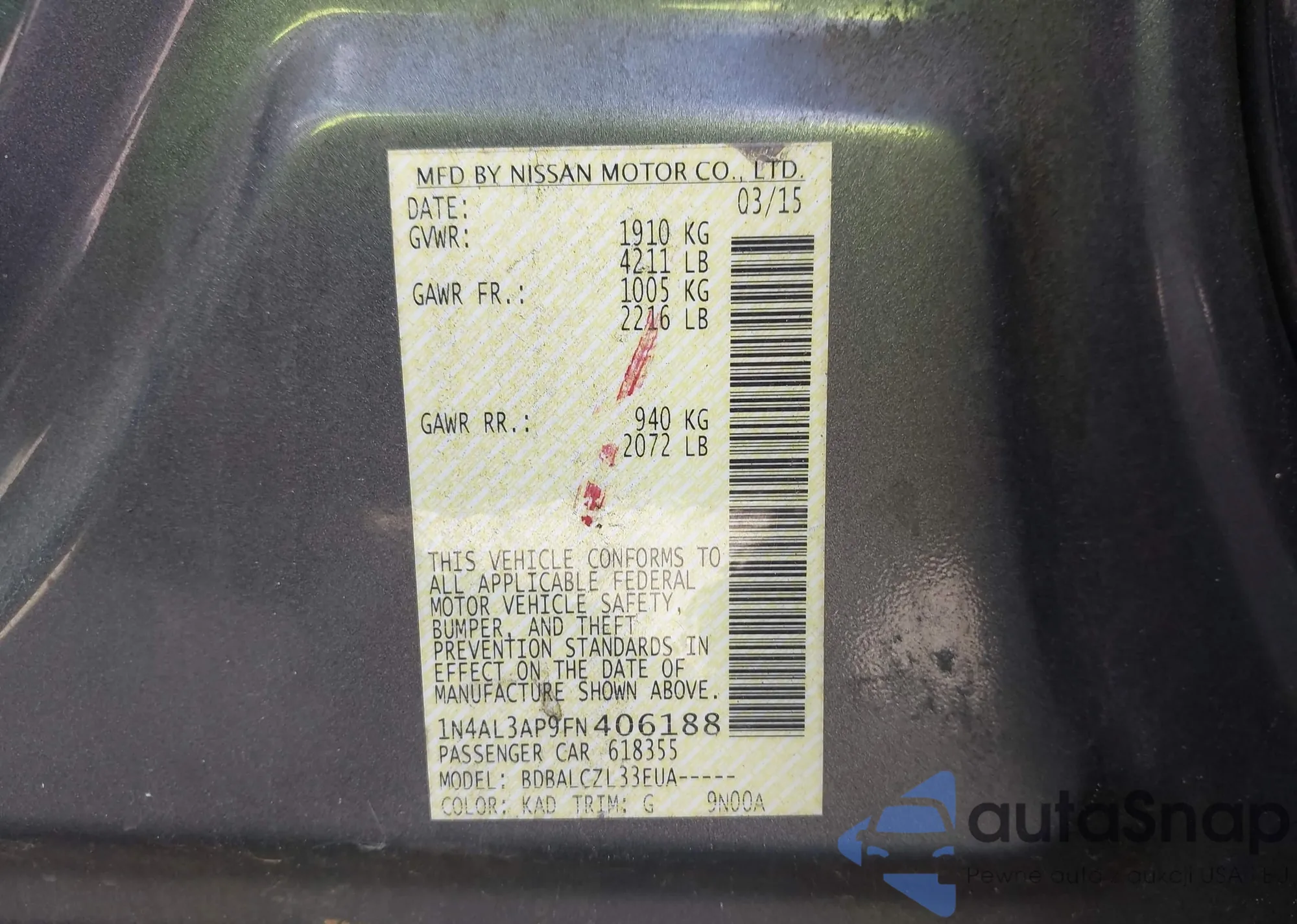 LOT: 43457187 VIN: 1N4AL3AP9FN406188