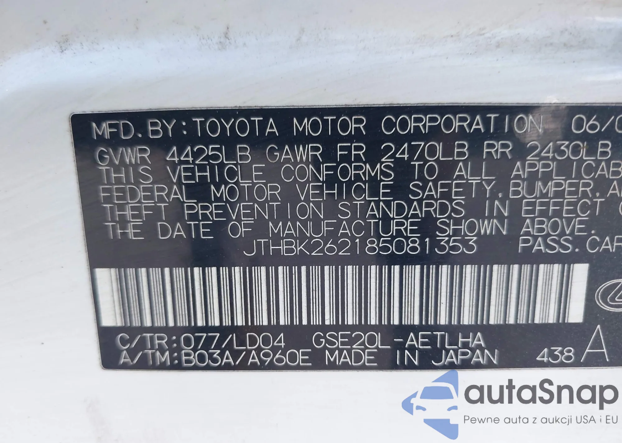 LOT: 43196760 VIN: 1HGCP3F82BA009062