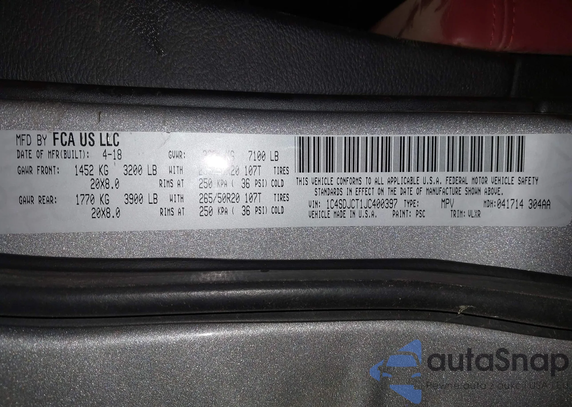 LOT: 43425205 VIN: 1C4SDJCT1JC400397