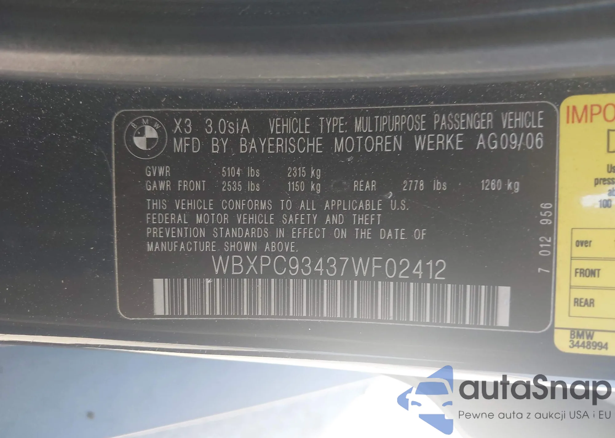 LOT: 43470886 VIN: WBXPC93437WF02412