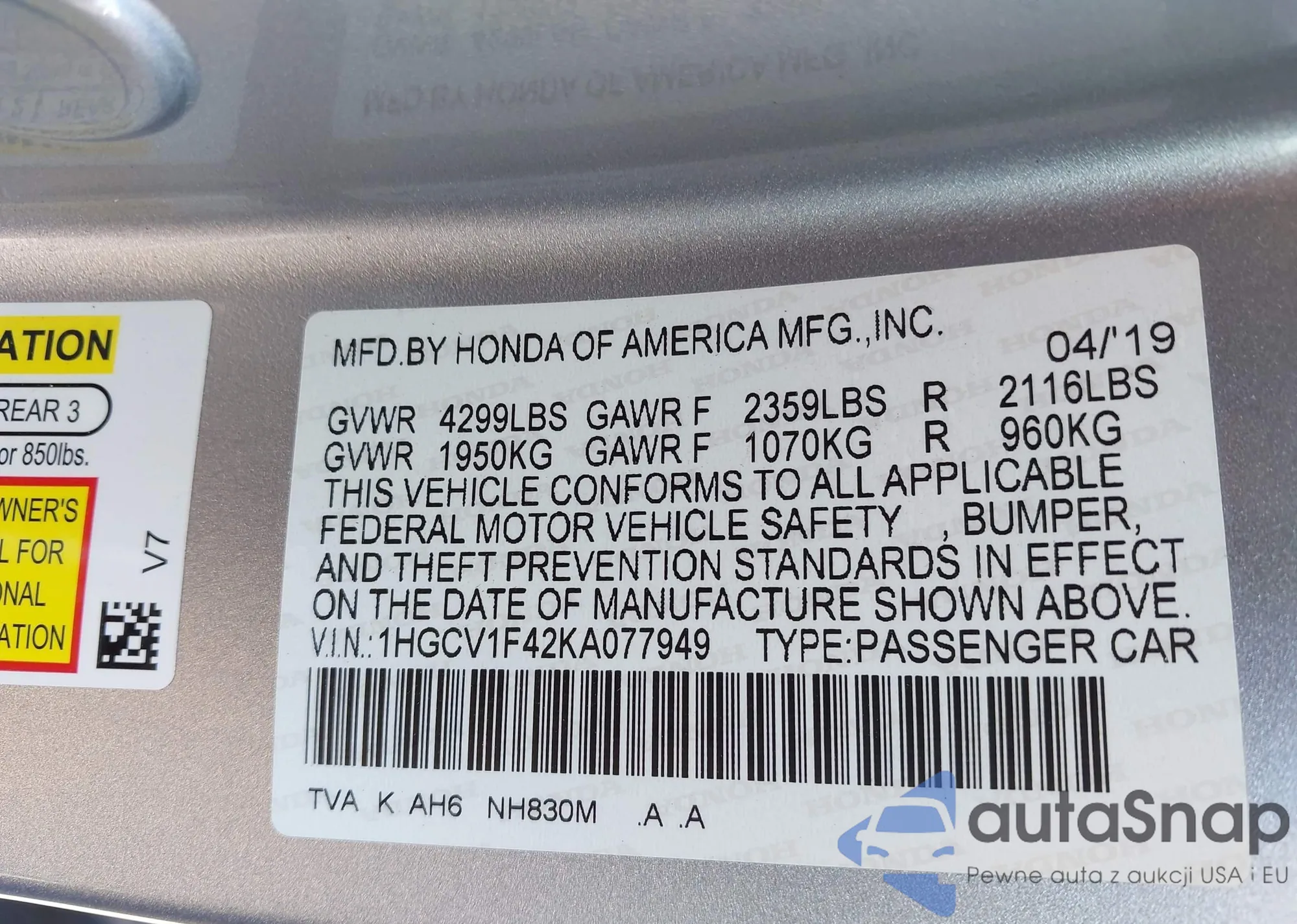 • VIN 1HGCV1F42KA077949