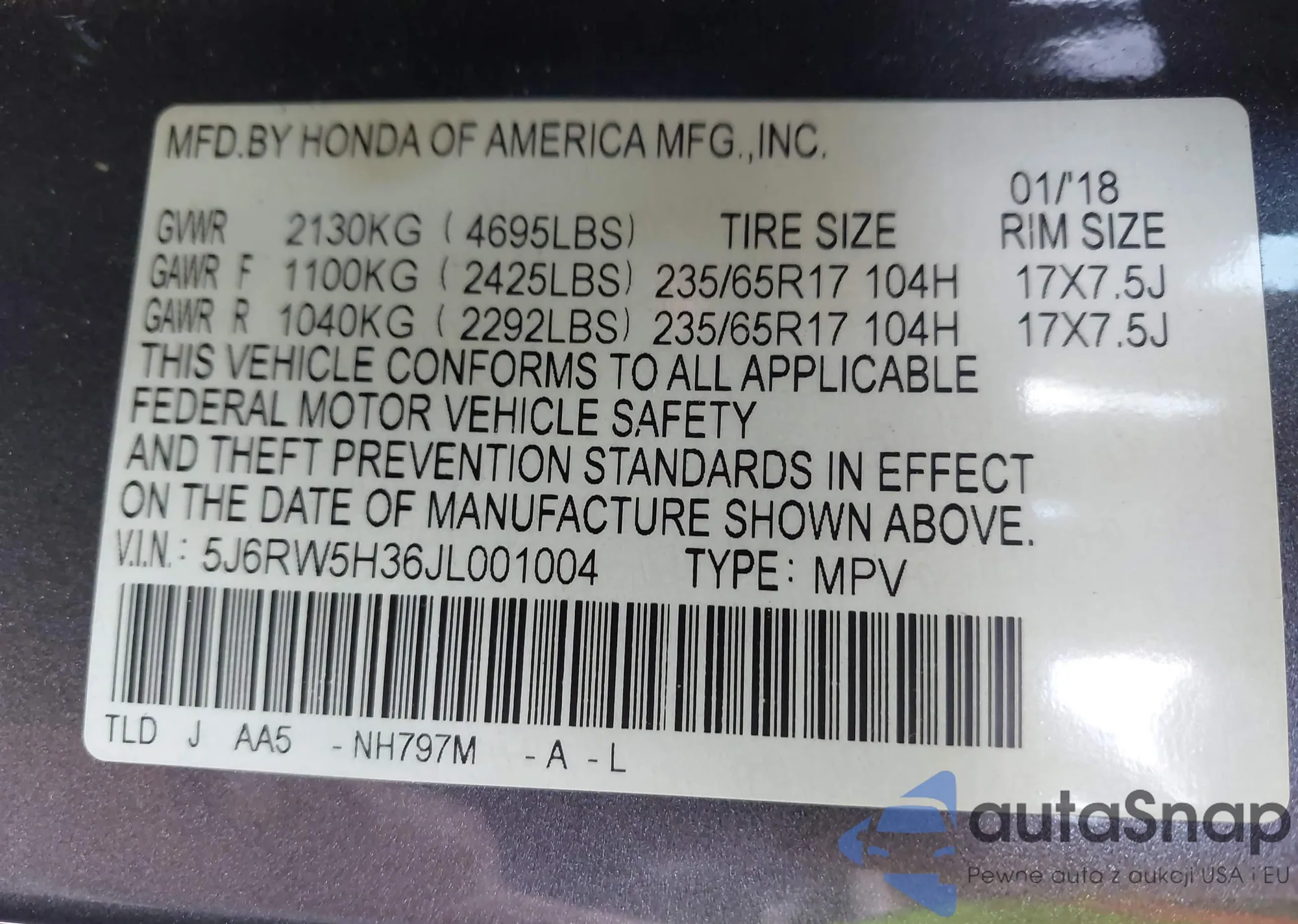 • VIN 5J6RM3H98FL001902