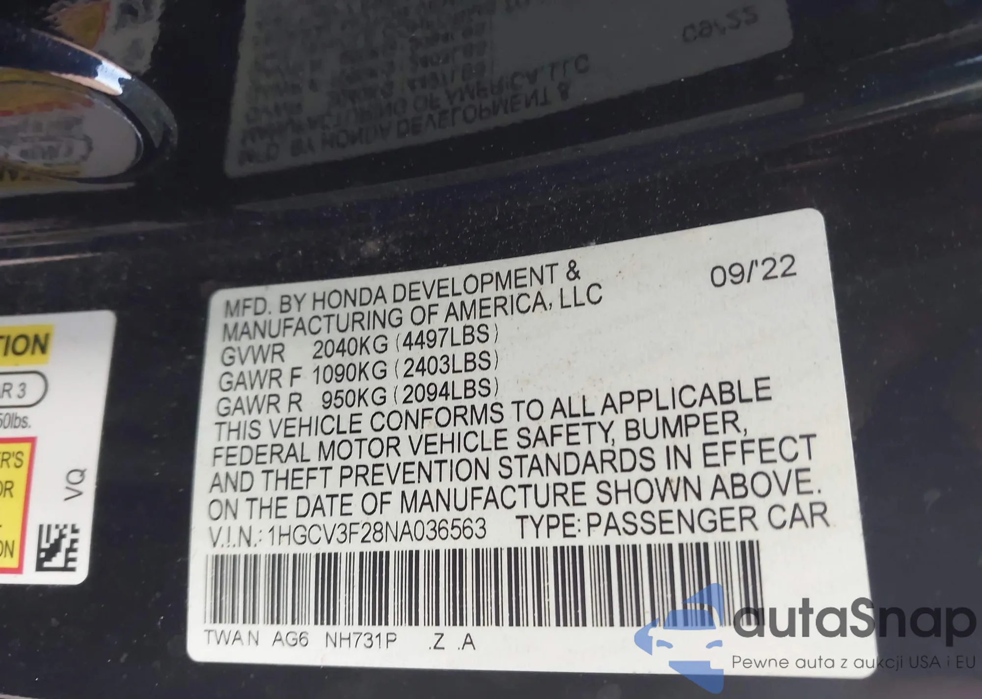 LOT: 43349575 VIN: 1HGCV3F28NA036563
