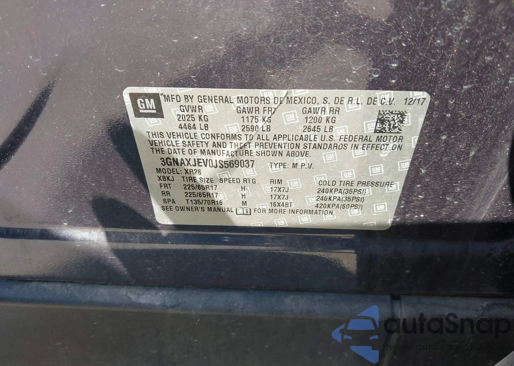 LOT: 43115588 VIN: 3GNAXJEV0JS569037