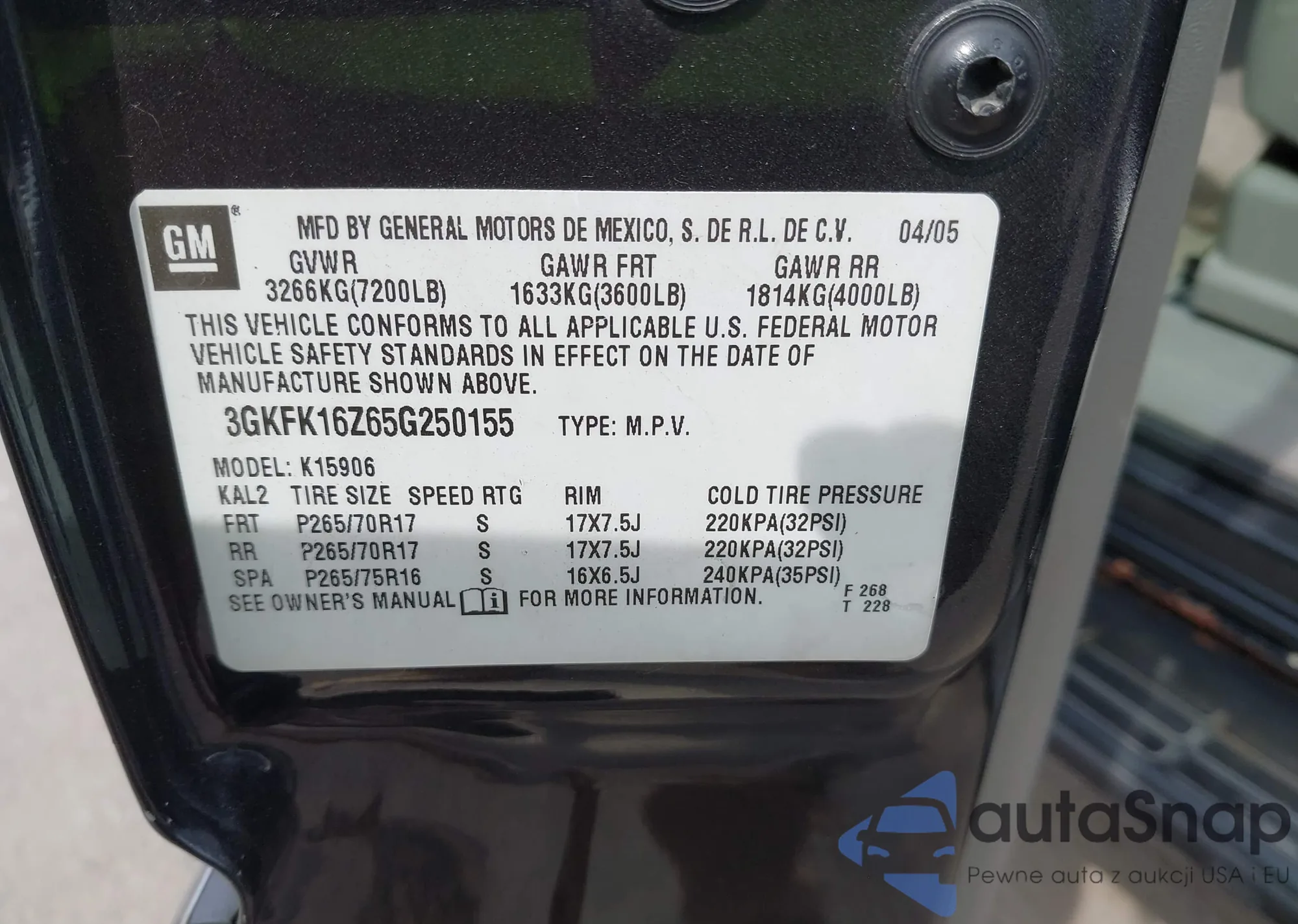 • VIN 3GKFK16Z65G250155