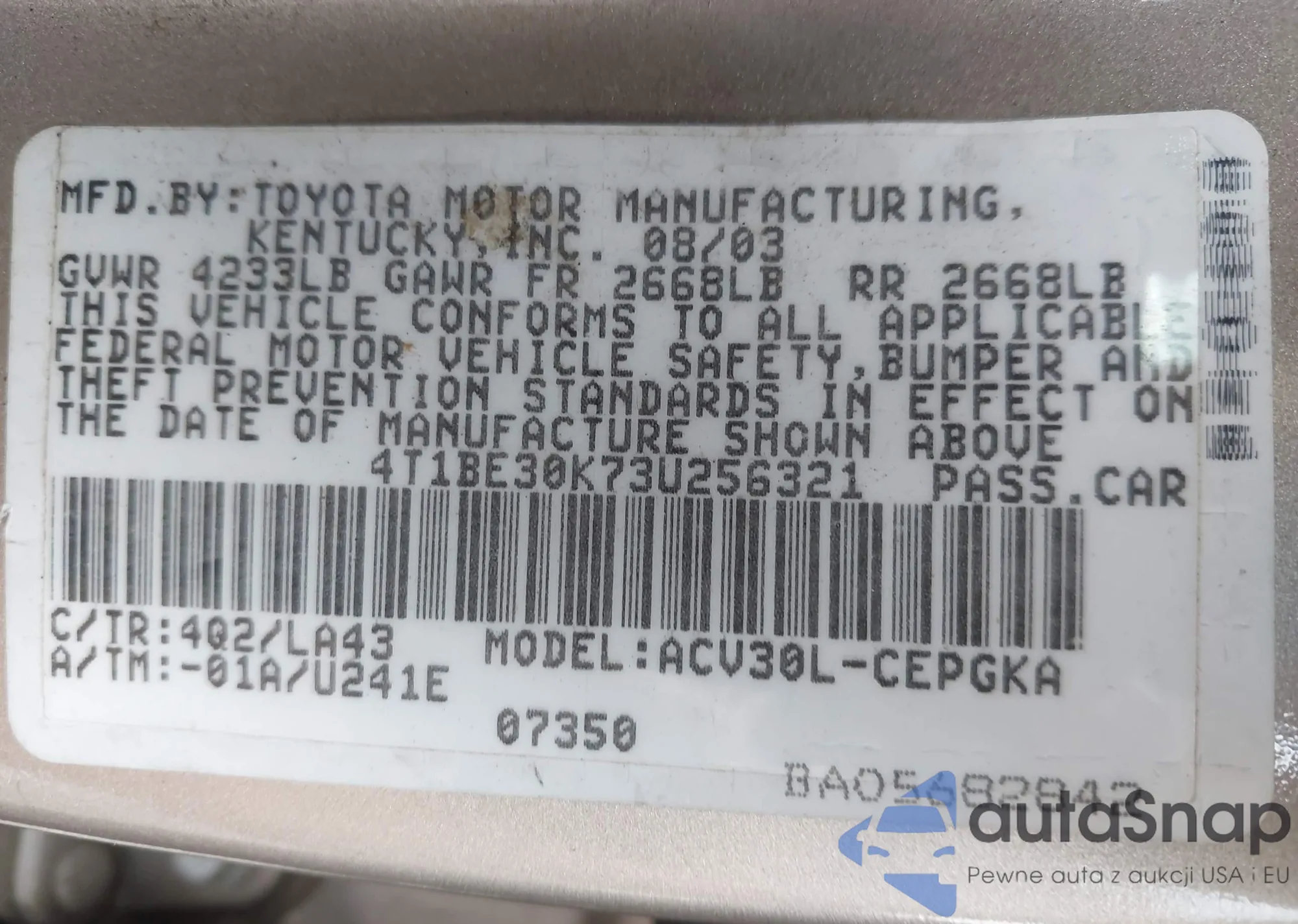• VIN 4T1BE30K73U256321
