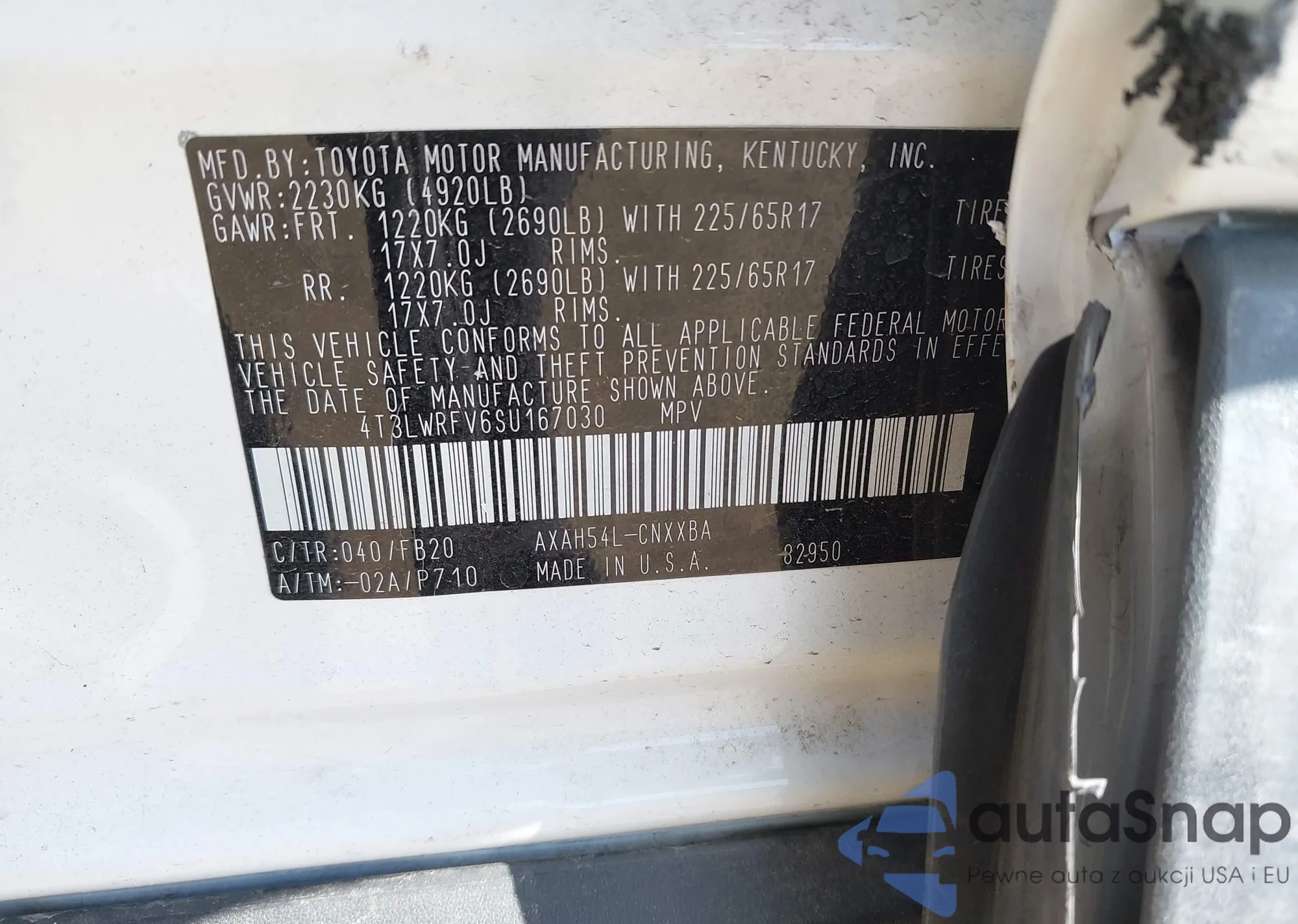 LOT: 43404790 VIN: 4T3LWRFV6SU167030