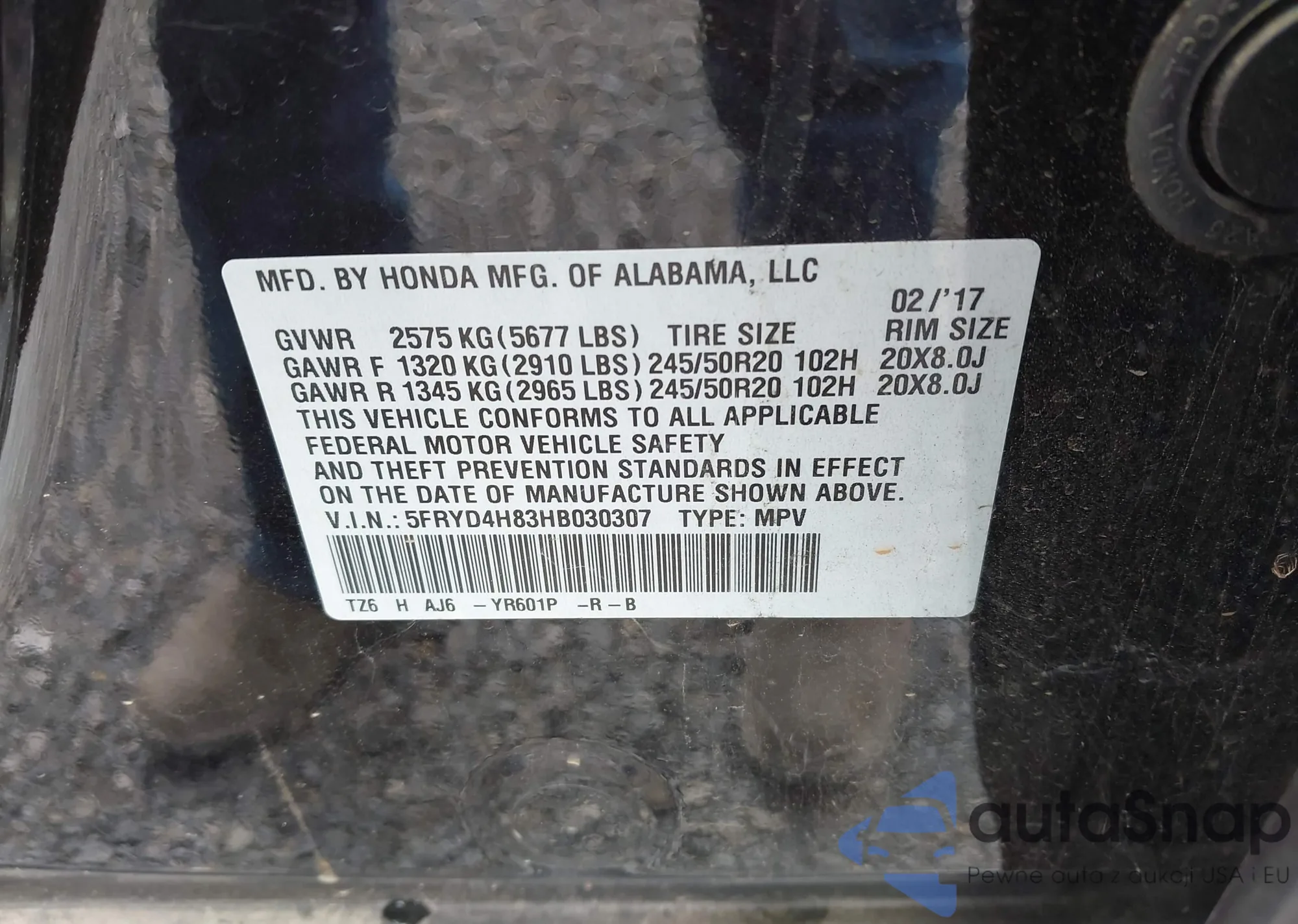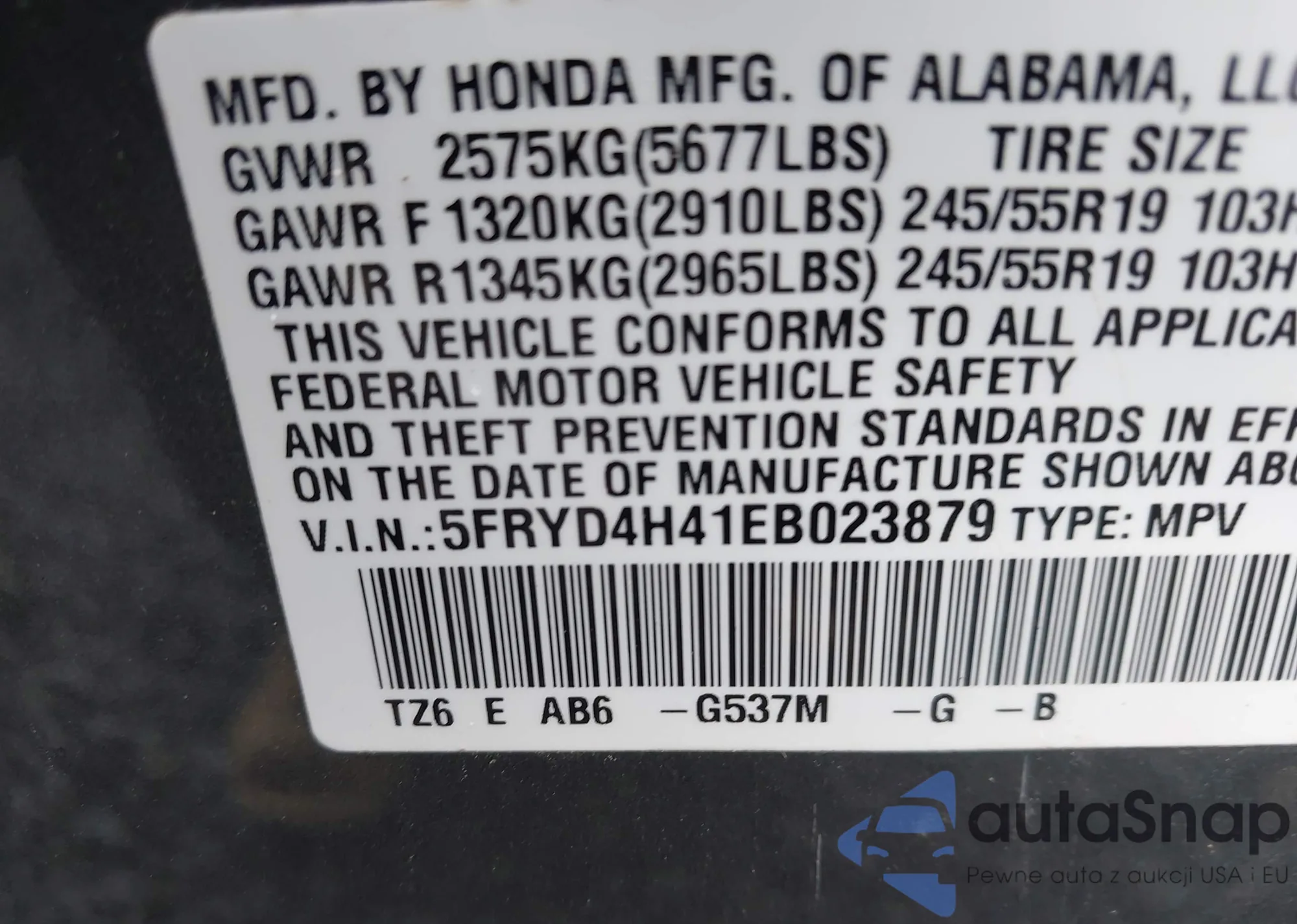 • VIN 5J6RM4H51FL083247