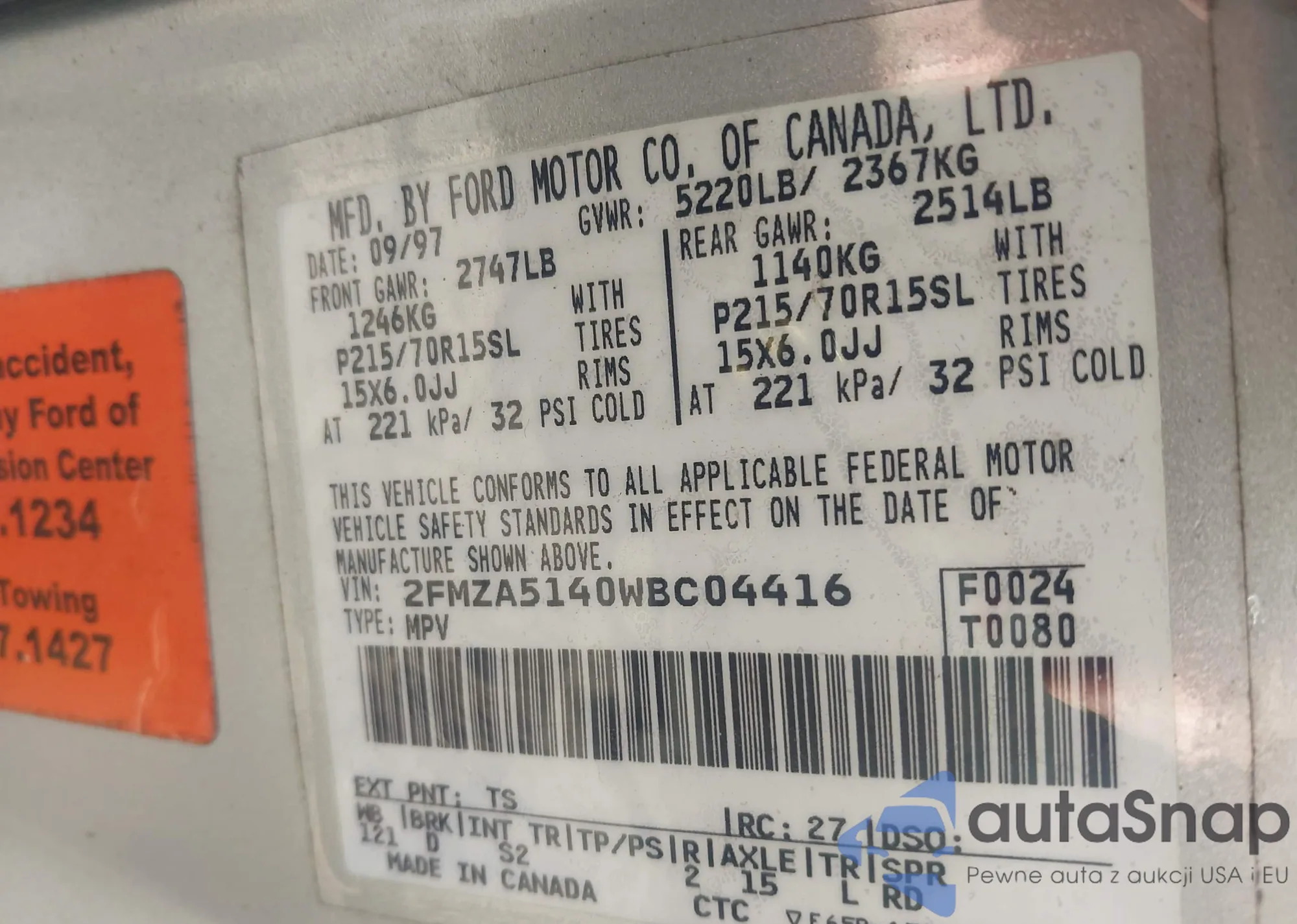 LOT: 43203456 VIN: 2FMZA5140WBC04416