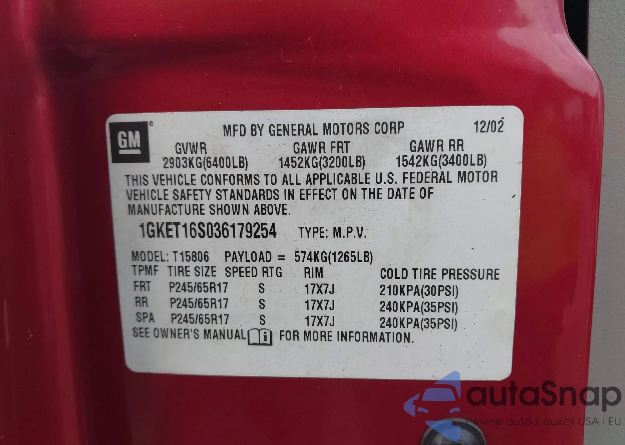 • VIN 1GKET16S036179254