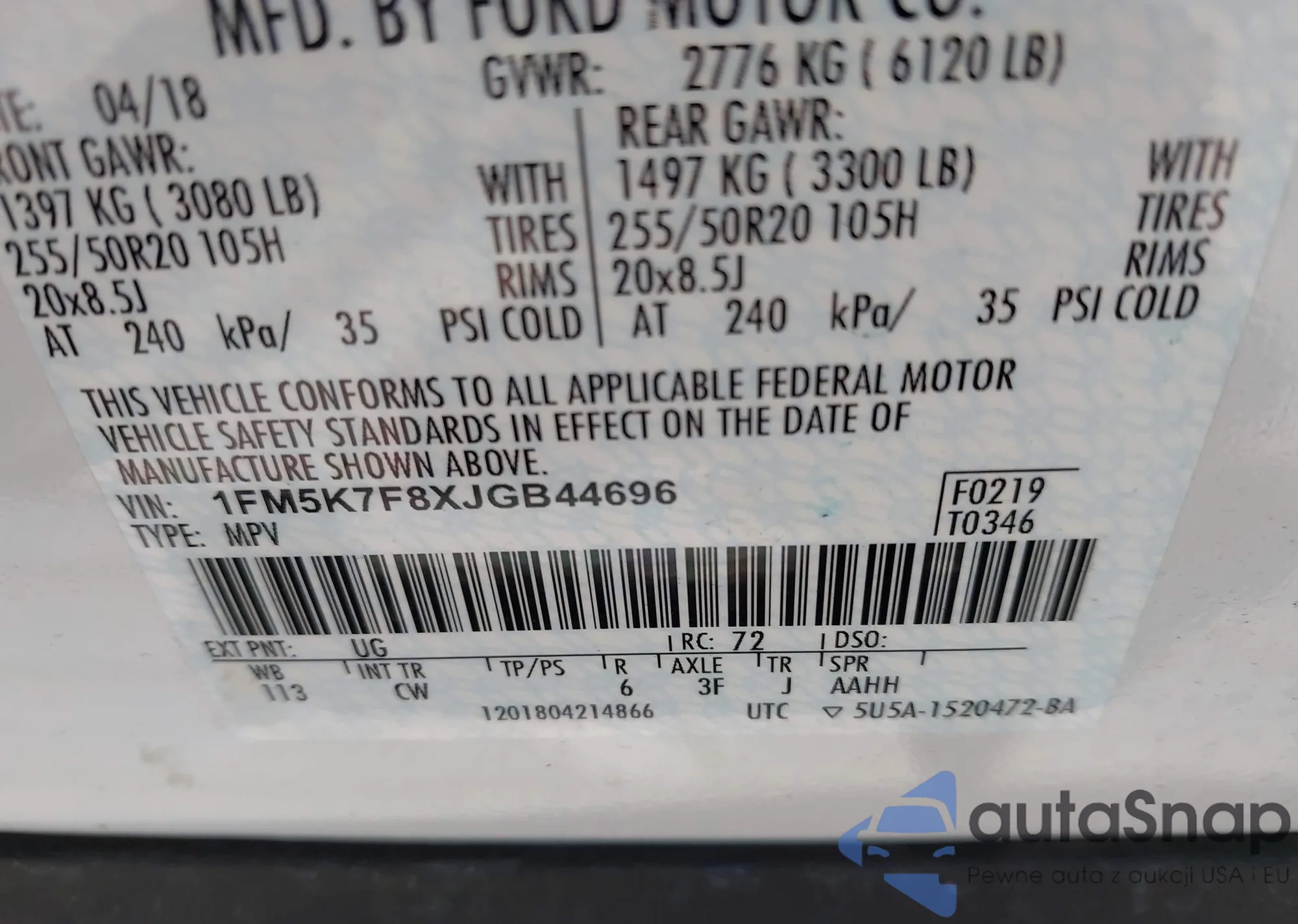 LOT: 42941465 VIN: 1FM5K7F8XJGB44696