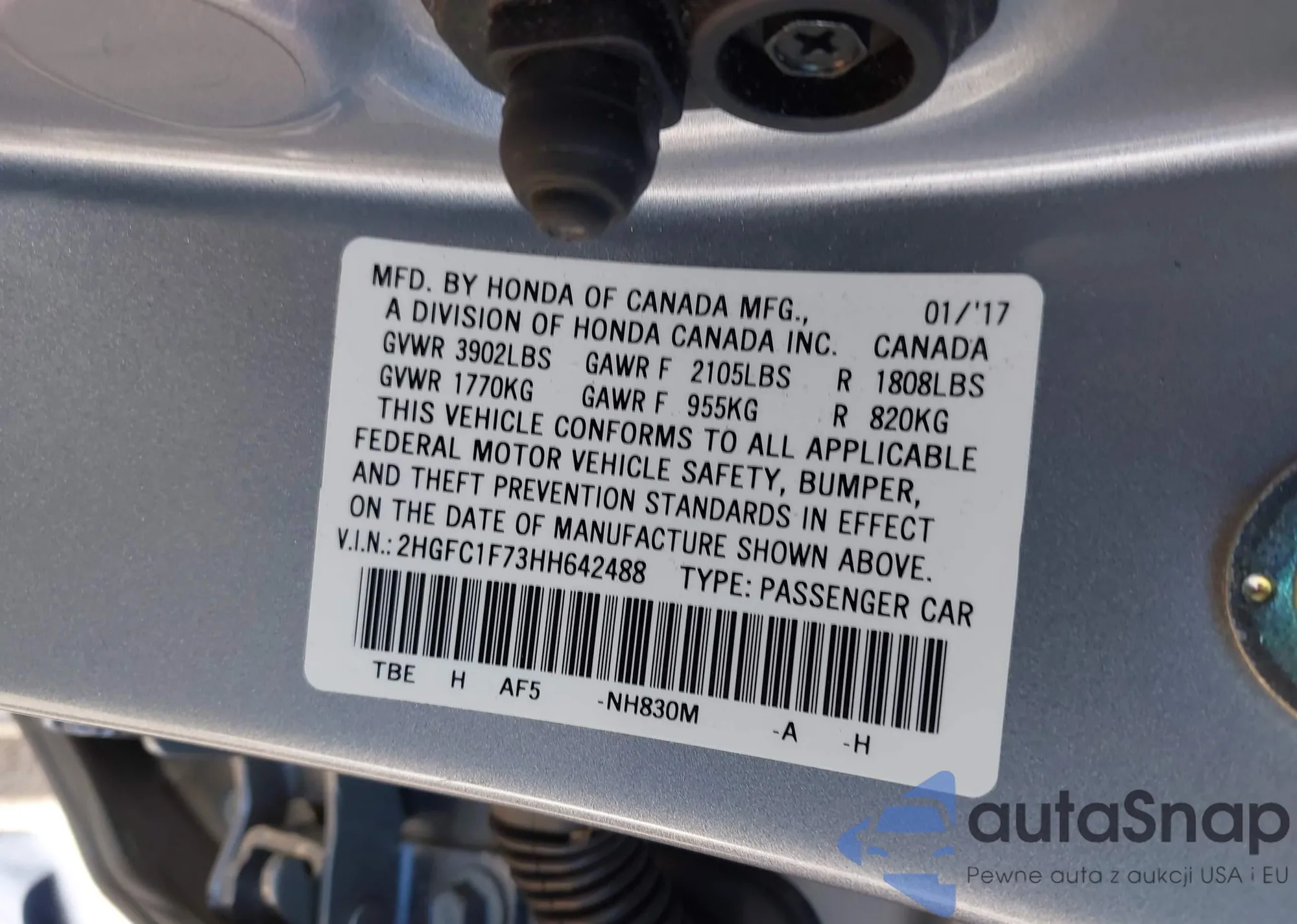 LOT: 42945624 VIN: 2HGFC1F73HH642488