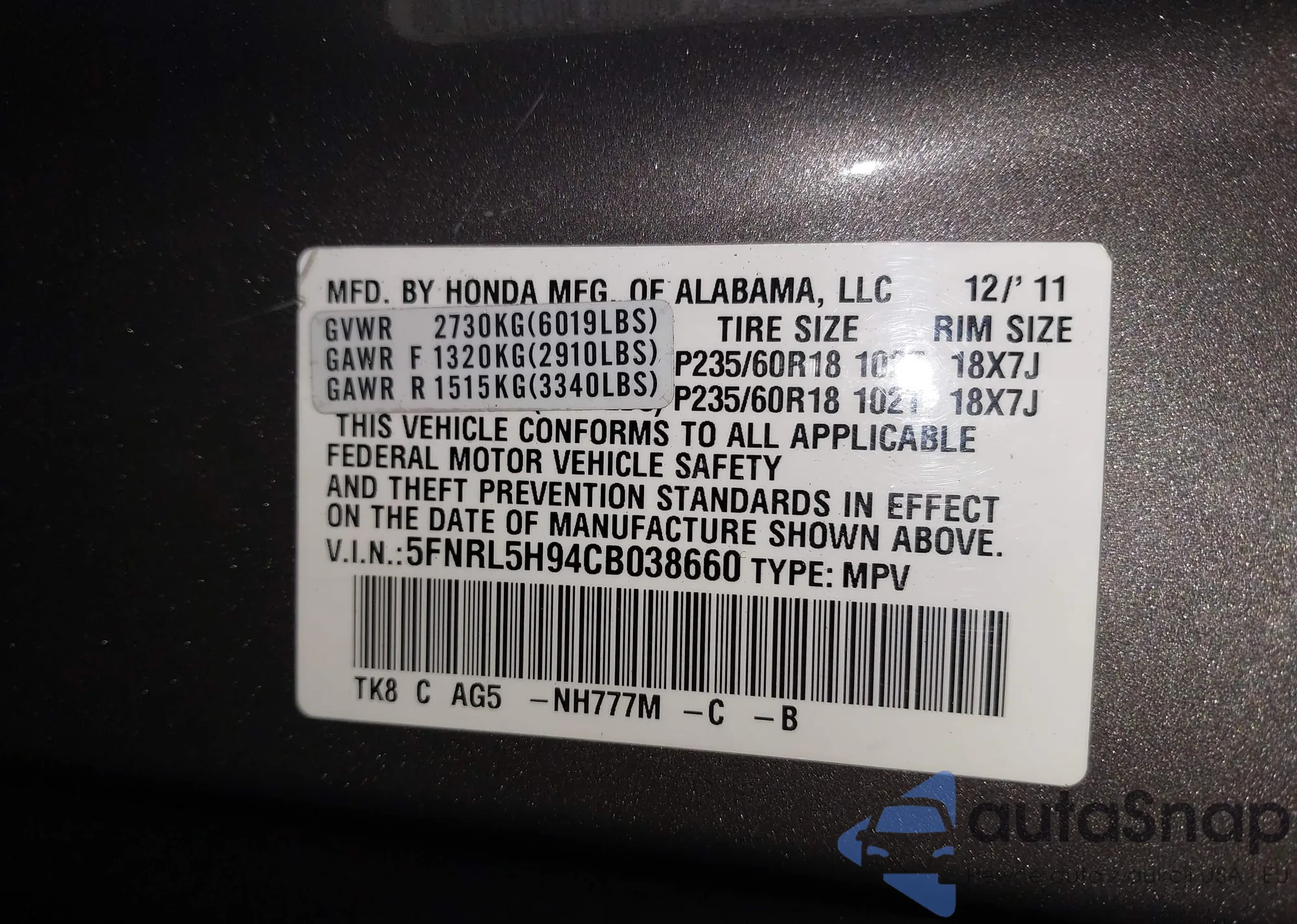 • VIN 5FNRL5H94CB038660