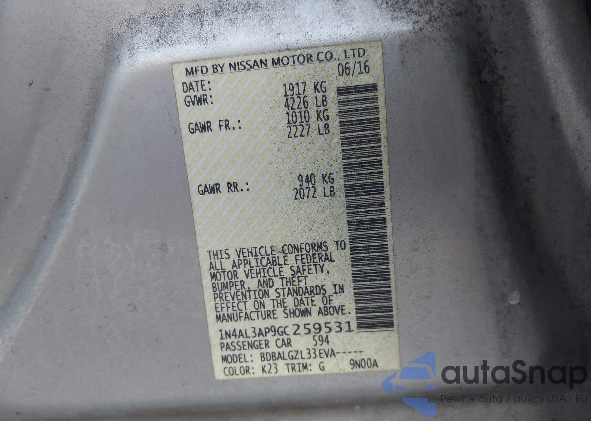 • VIN 1N4AL3AP9GC259531