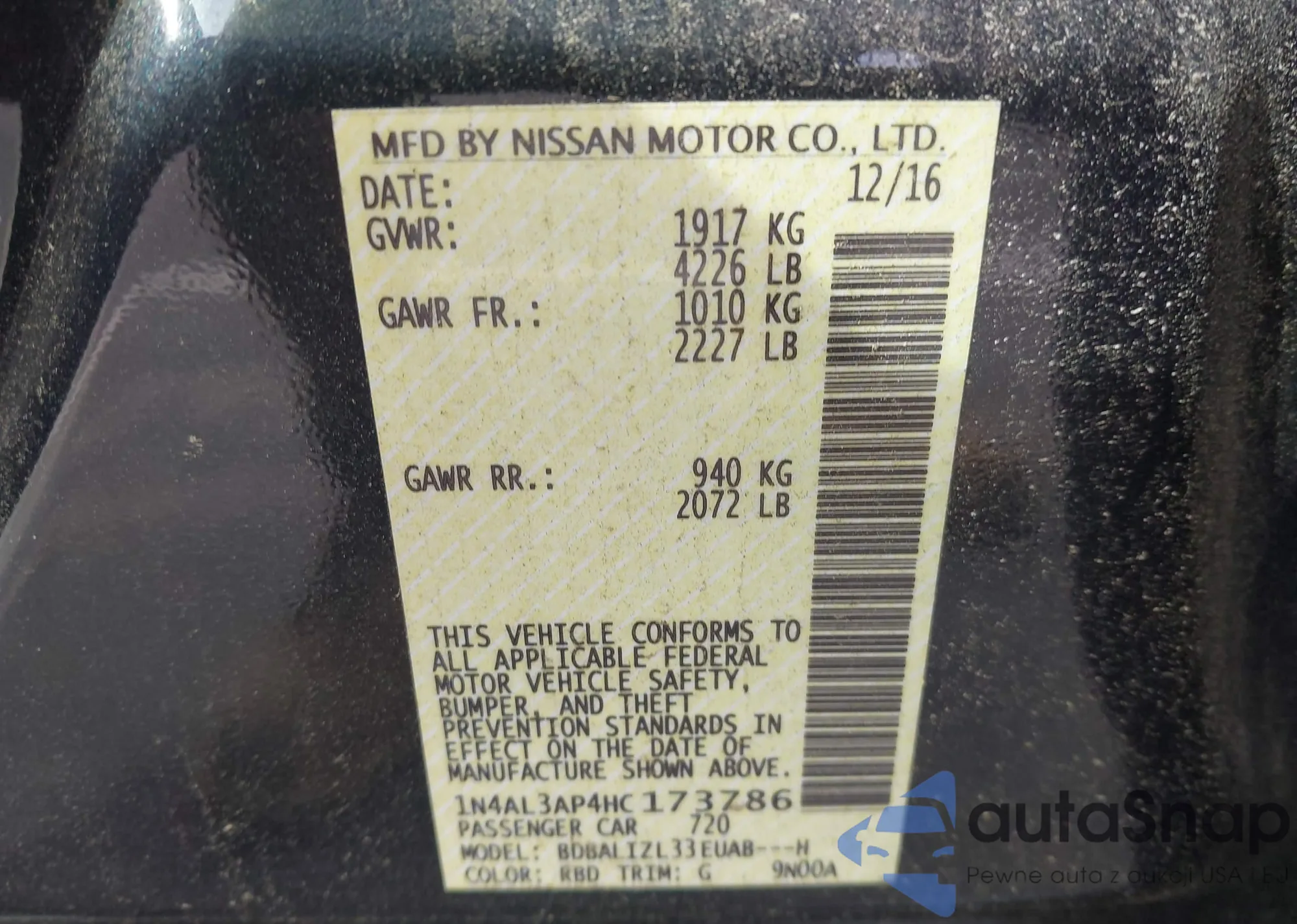 LOT: 43081386 VIN: 1N4AL3AP4HC173786