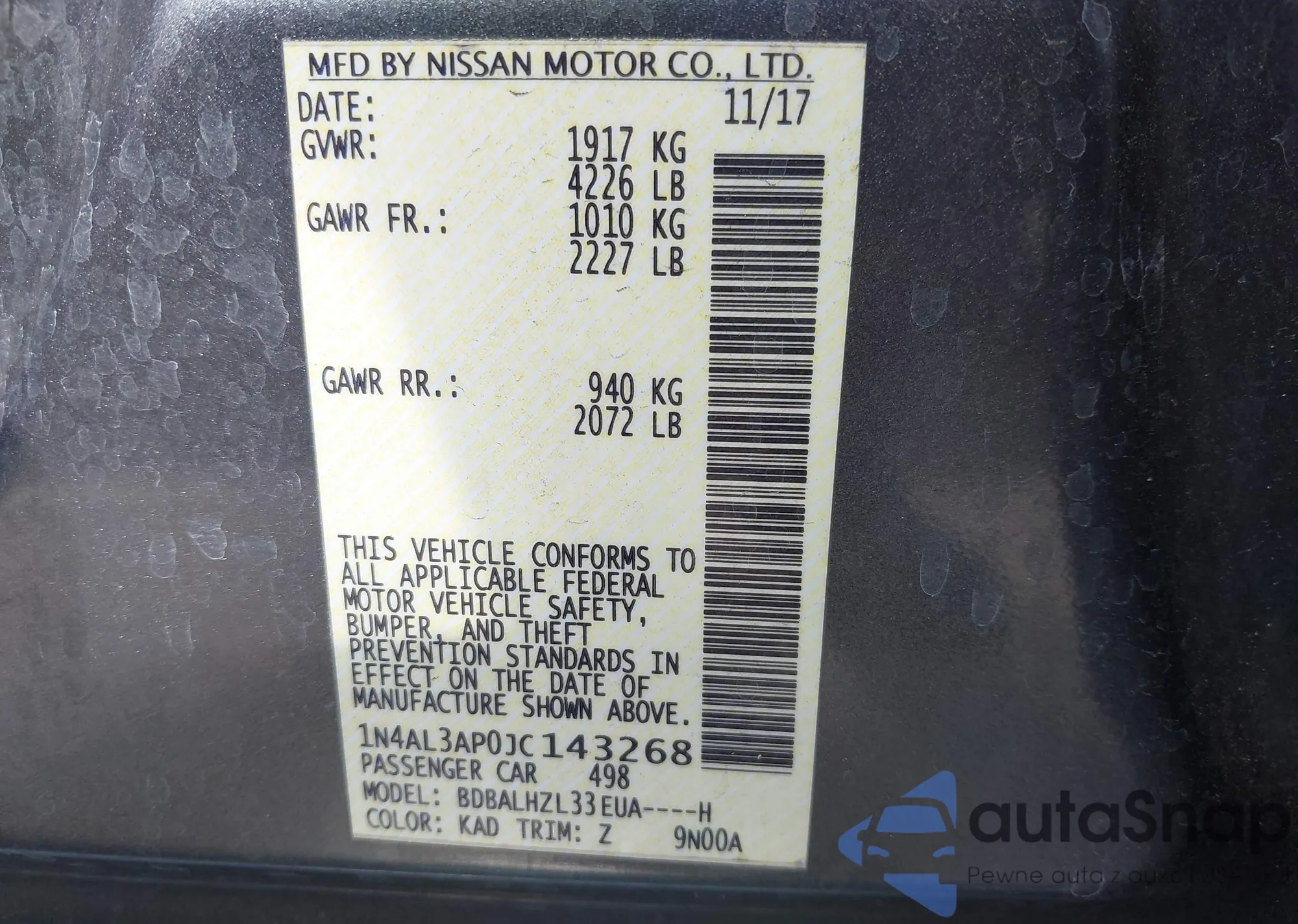 LOT: 43334542 VIN: 1N4AL3AP0JC143268